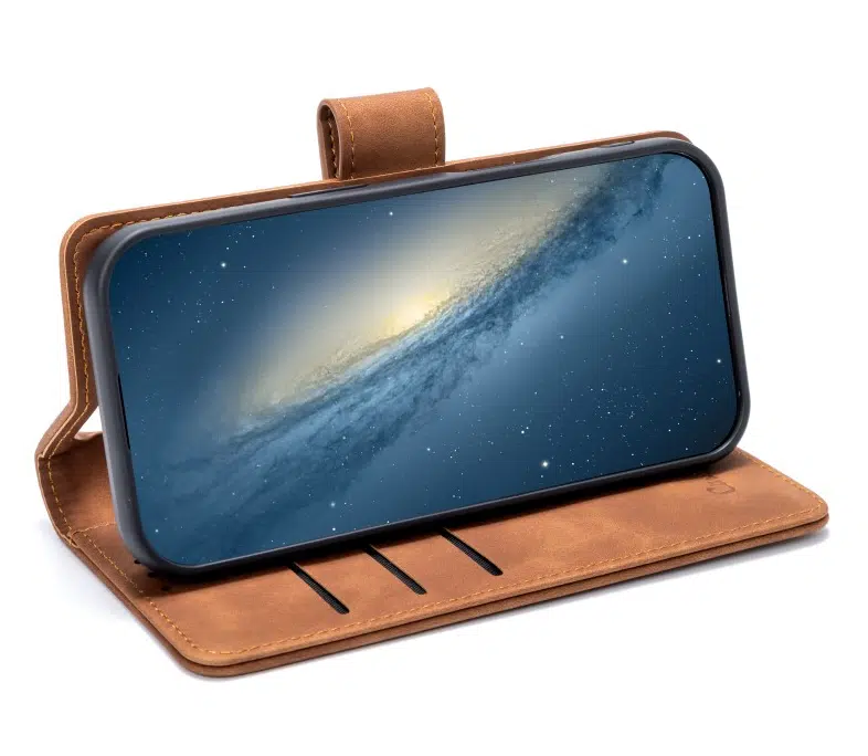 Het unieke 2-in-1 systeem combineert een afneembare, magnetische backcover met een luxe bookcase. Gebruik de stevige bookcase wanneer je volledige bescherming en pasjesruimte nodig hebt, of kies voor de slanke backcover voor een lichtere setup. Beide onderdelen klikken eenvoudig magnetisch in elkaar.