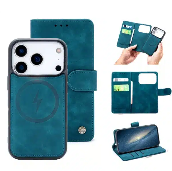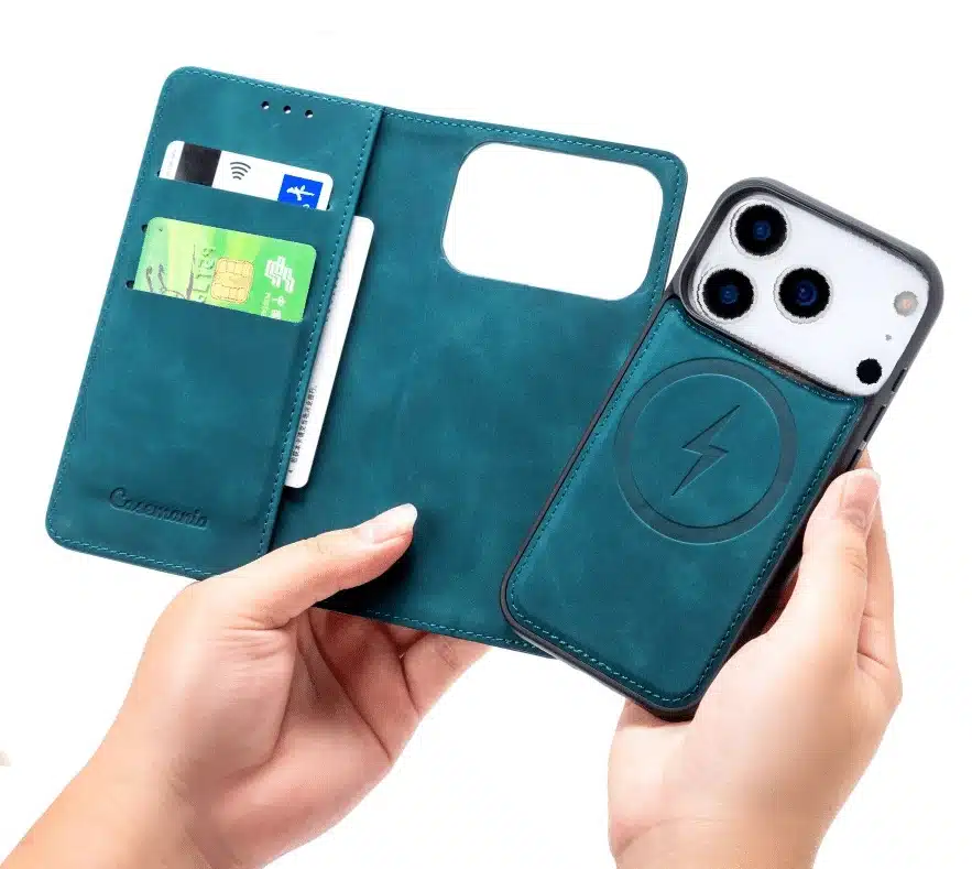 Het unieke 2-in-1 systeem combineert een afneembare, magnetische backcover met een luxe bookcase. Gebruik de stevige bookcase wanneer je volledige bescherming en pasjesruimte nodig hebt, of kies voor de slanke backcover voor een lichtere setup. Beide onderdelen klikken eenvoudig magnetisch in elkaar.