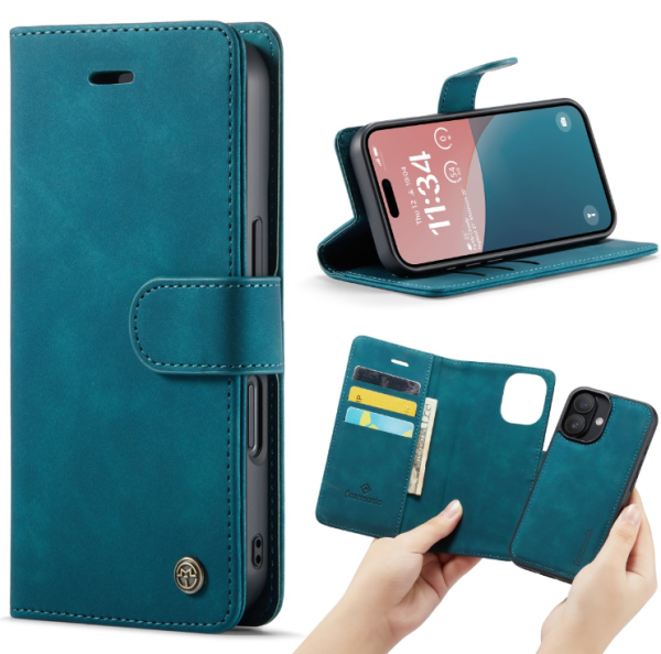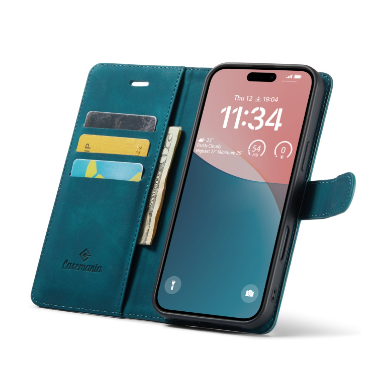 Casemania iPhone 16 Book cover hoesje. De iPhone 16 – Bookcase incl. Pasjeshouder is een hoesje van goede kwaliteit met een magnetische sluiting. Er zitten 3 pashouders in het hoesje samen met een vakje voor pasfoto’s en een extra flap waar eventueel briefgeld in bewaard kan worden. Doordat dit hoesje vervaardigd is uit goede kwaliteit stof heeft het een lange levensduur. Daarnaast ziet het hoesje er zeer modern en goed uit, wat het één van onze beste keuzes maakt. Deze iPhone 16 wallet book case is een zeer stevige hoes gemaakt van kunstleer, wat zeer aangenaam in de hand ligt. Daarnaast beschermt de hoes je telefoon goed tegen krassen en stoten. Het kunstlederen materiaal is verwerkt in de hele hoes. Doordat dit kunstlederen materiaal erg zacht is, wordt het beeldscherm van je telefoon ook goed beschermd en voorkom je krassen in het display. Met de hoes bescherm je dus je volledige telefoon. De installatie van de hoes is zeer eenvoudig. Door de toestel specifieke pasvorm klik je de smartphone eenvoudig in de hoes. De knoppen, aansluiten en camera blijven volledig vrij