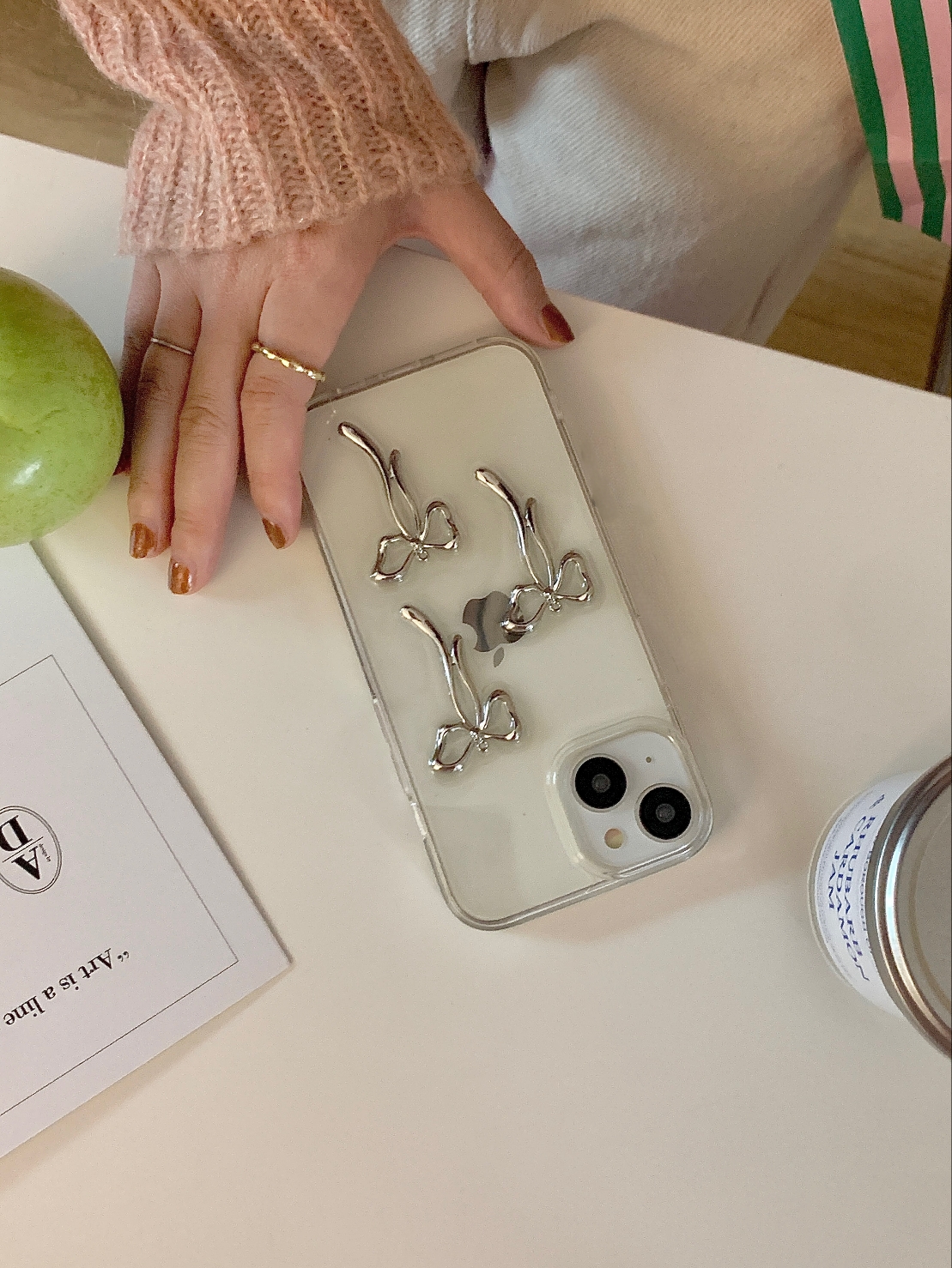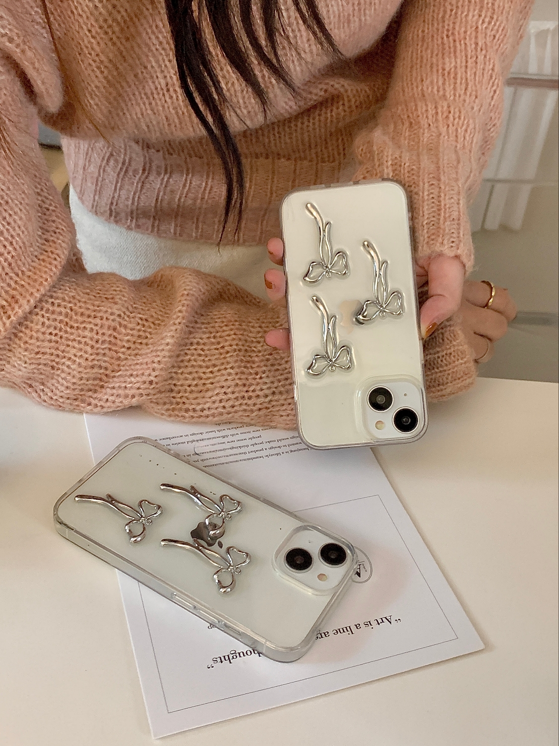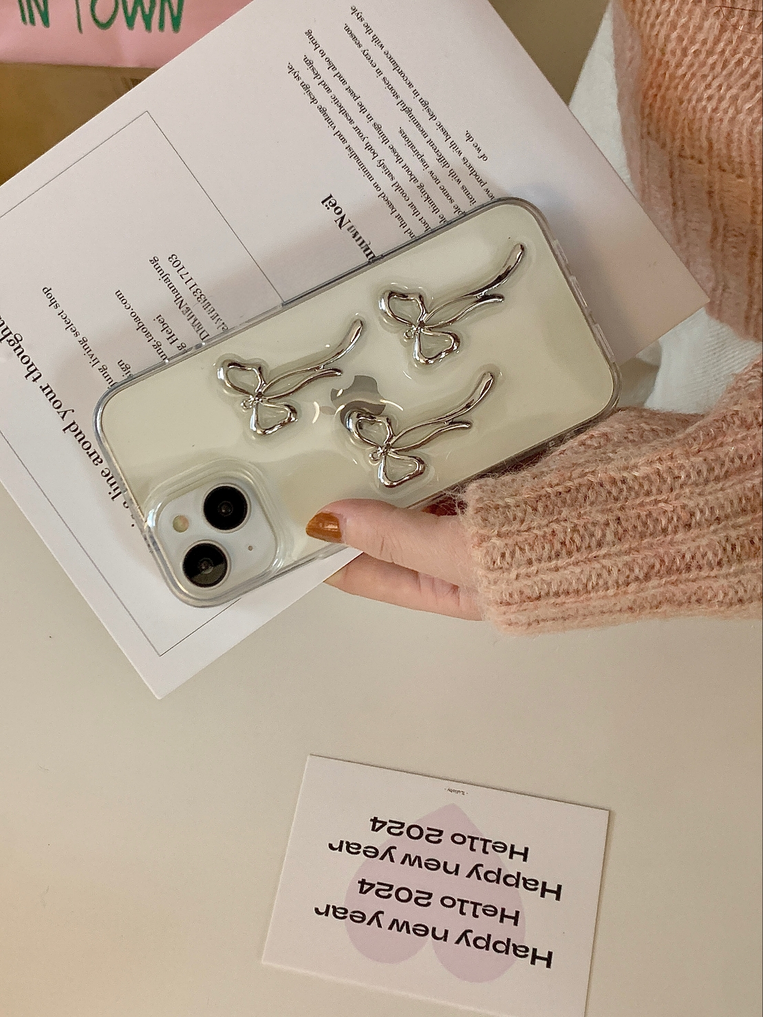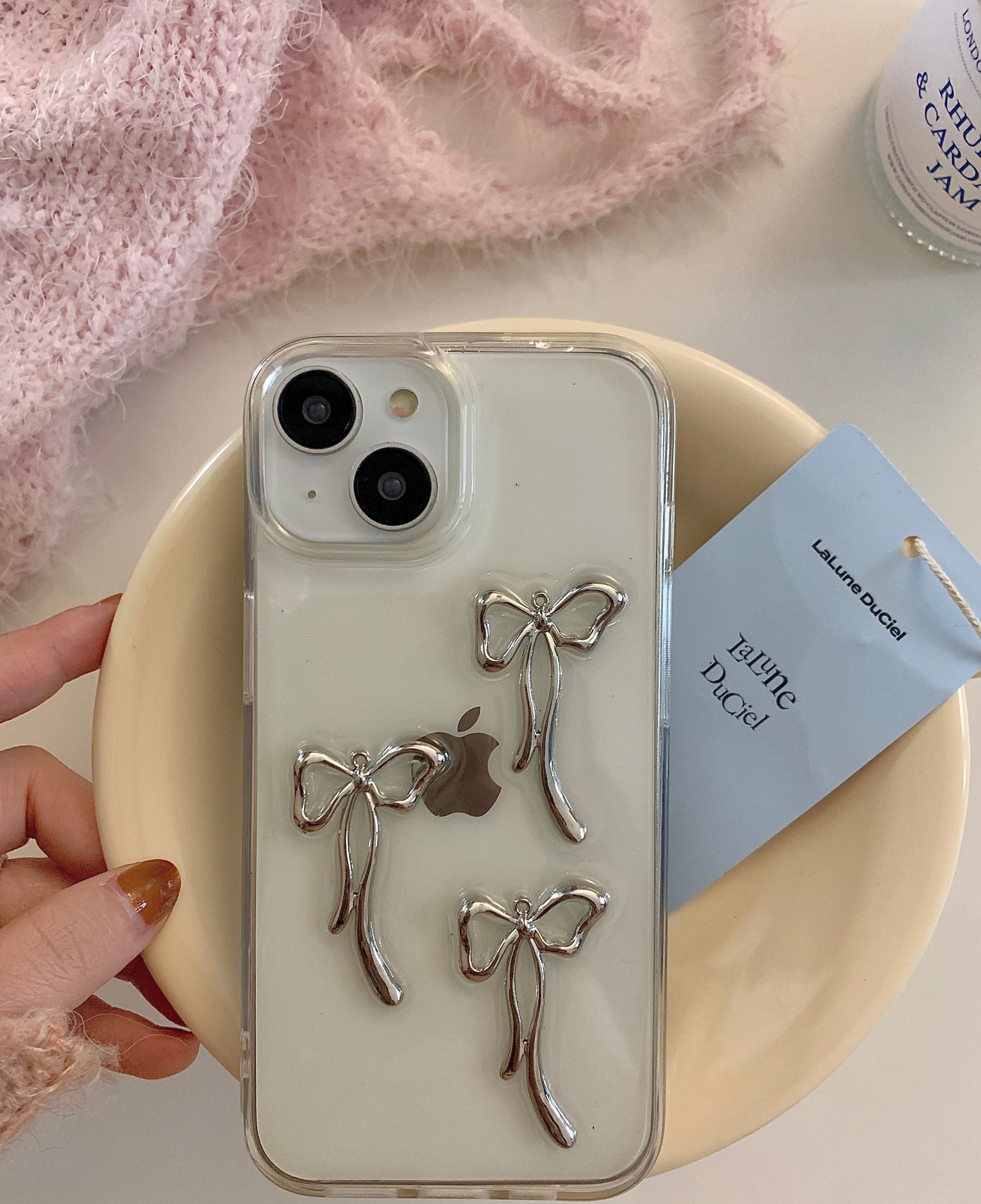 Cityhoesje -Backcover iPhone 14 Plus-15 Plus – Transparant – Strikjes Grijs