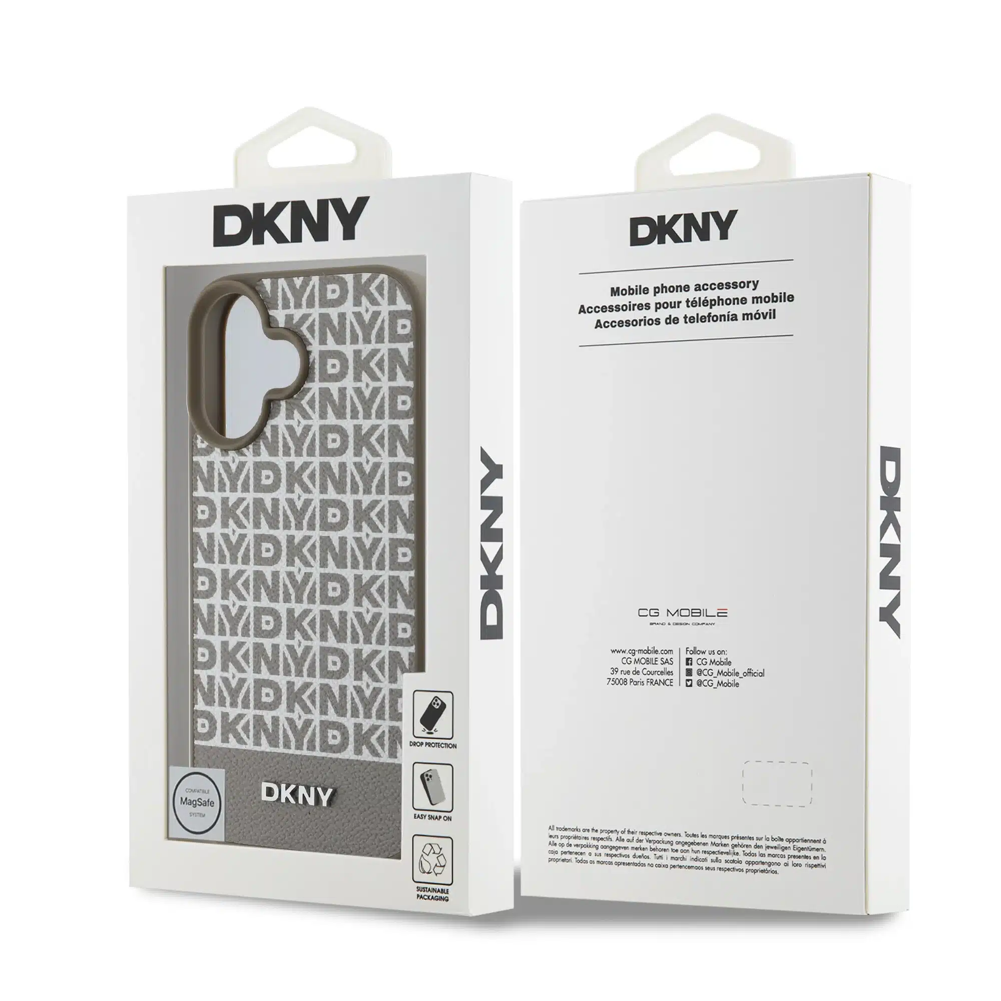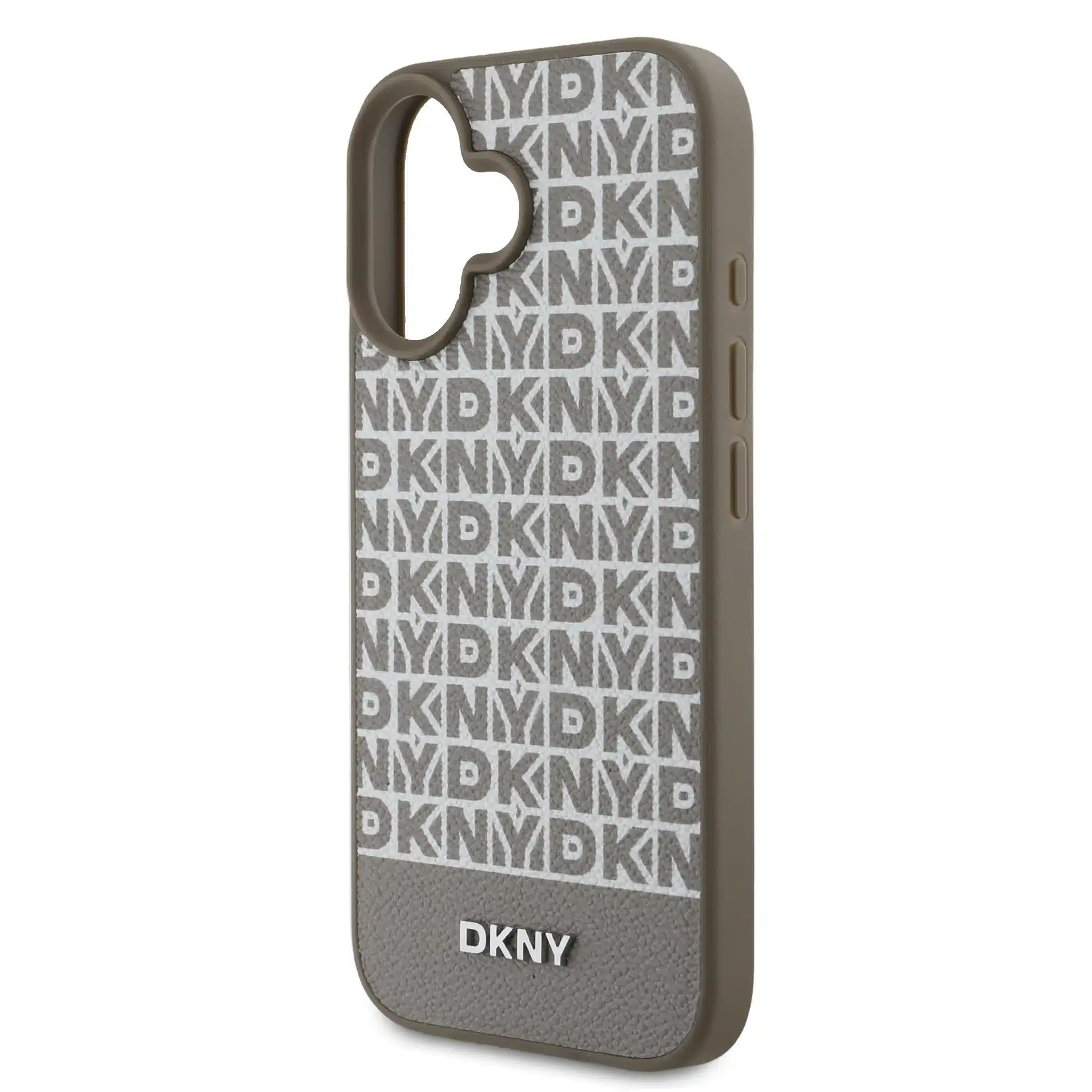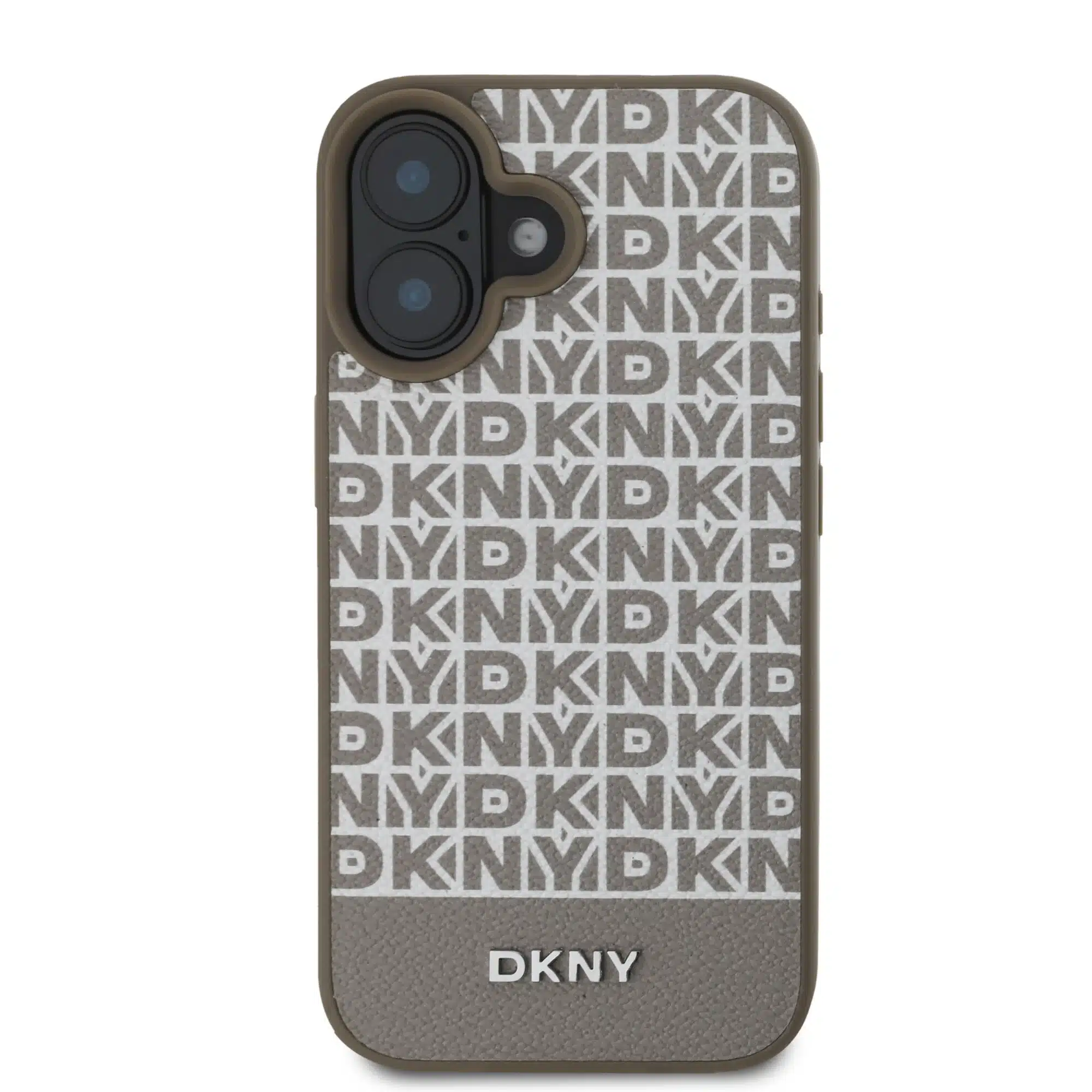 DKNY – Backcover iPhone 16 – PU Leather Repeat Pattern Bottom Stripe – MagSafe – Bruin