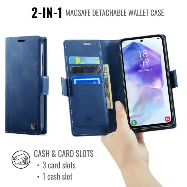 Deze luxe 2-in-1 wallet case van Solidenz combineert elegantie met functionaliteit. Dankzij het afneembare magnetische ontwerp gebruik je jouw telefoon flexibel zoals jij dat wilt: als bookcase voor extra bescherming en pasjesruimte, of als los hoesje voor onderweg. Volledig compatibel met MagSafe opladen!