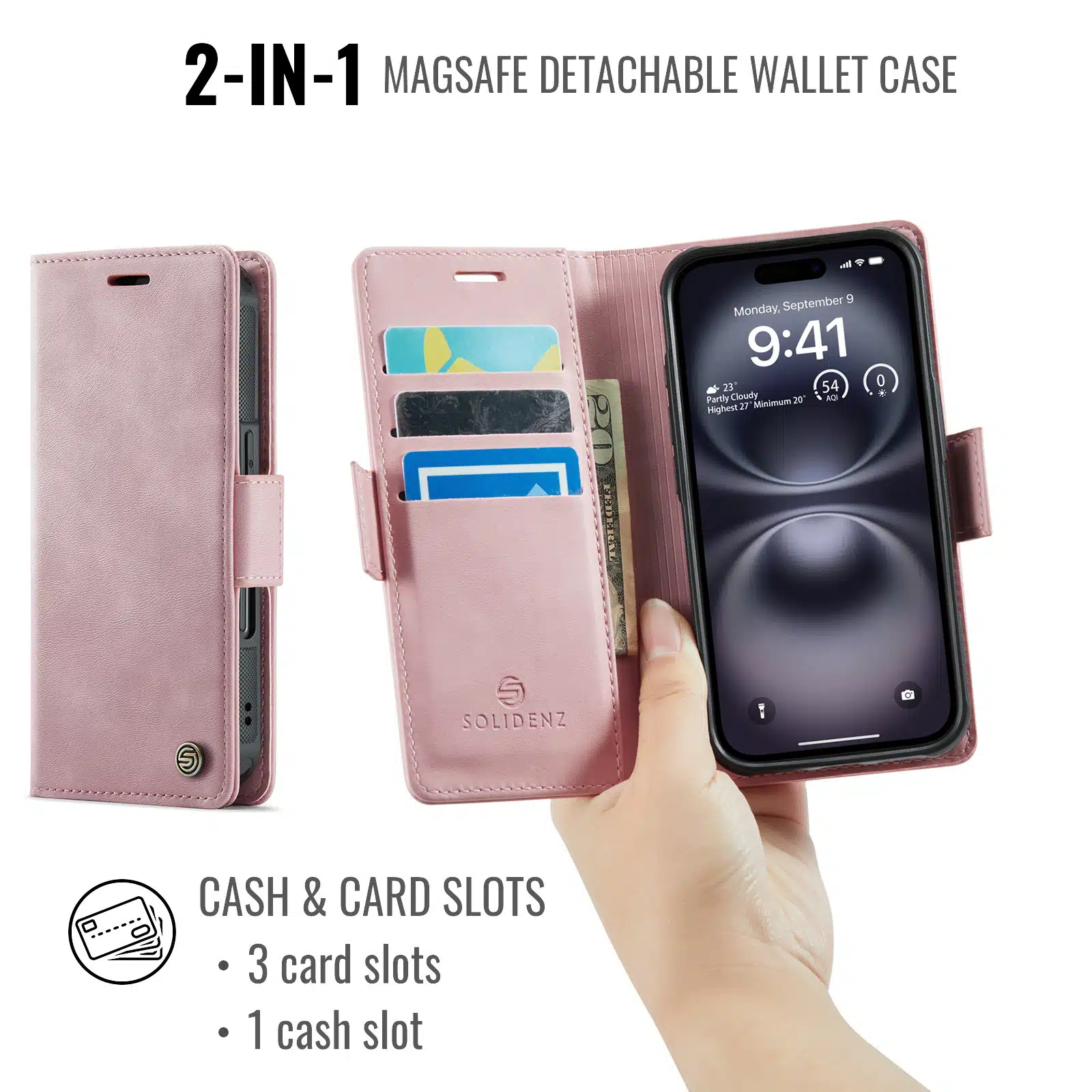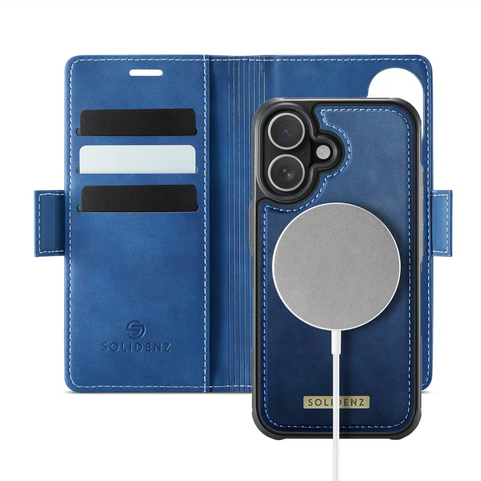 Deze luxe 2-in-1 wallet case van Solidenz combineert elegantie met functionaliteit. Dankzij het afneembare magnetische ontwerp gebruik je jouw telefoon flexibel zoals jij dat wilt: als bookcase voor extra bescherming en pasjesruimte, of als los hoesje voor onderweg. Volledig compatibel met MagSafe opladen!
