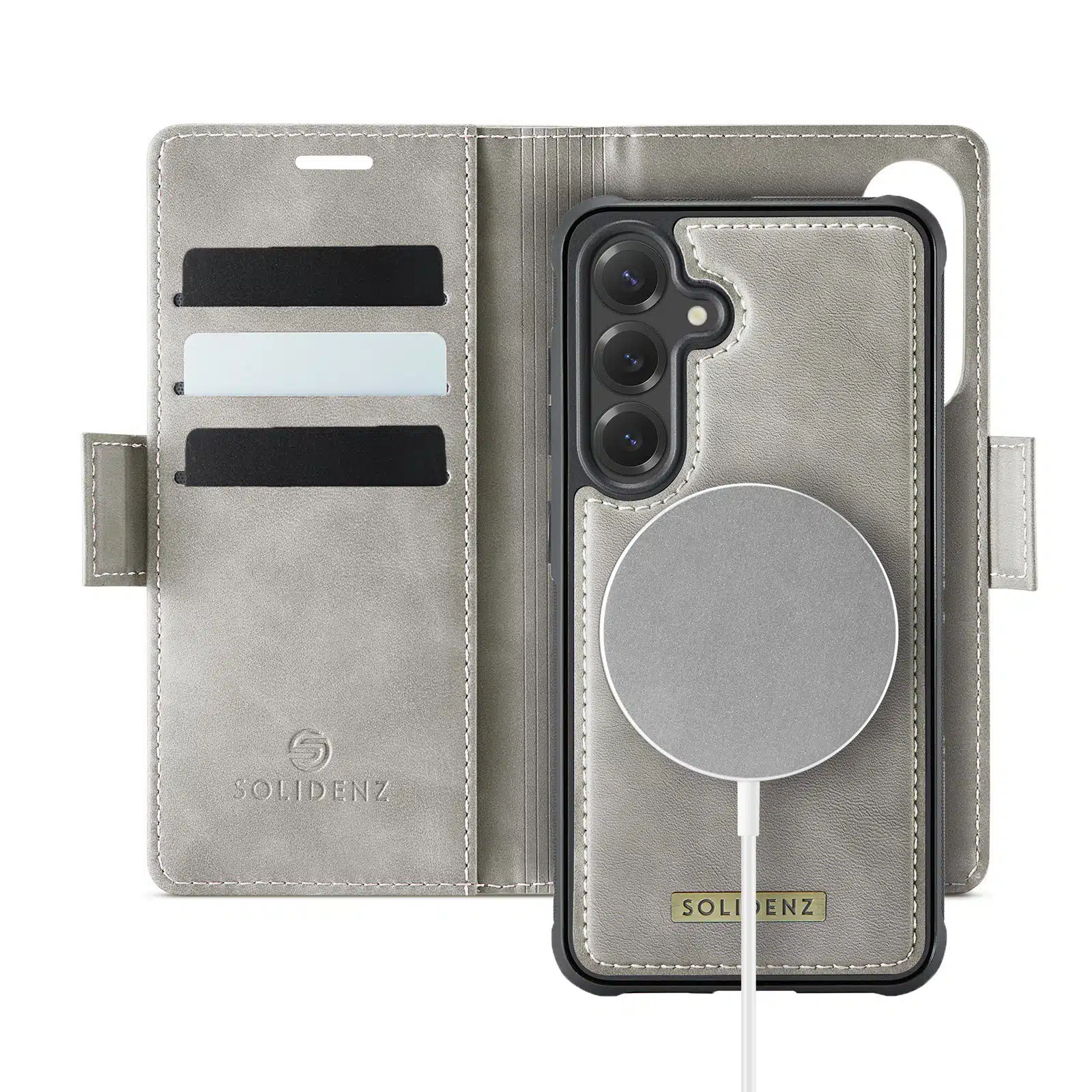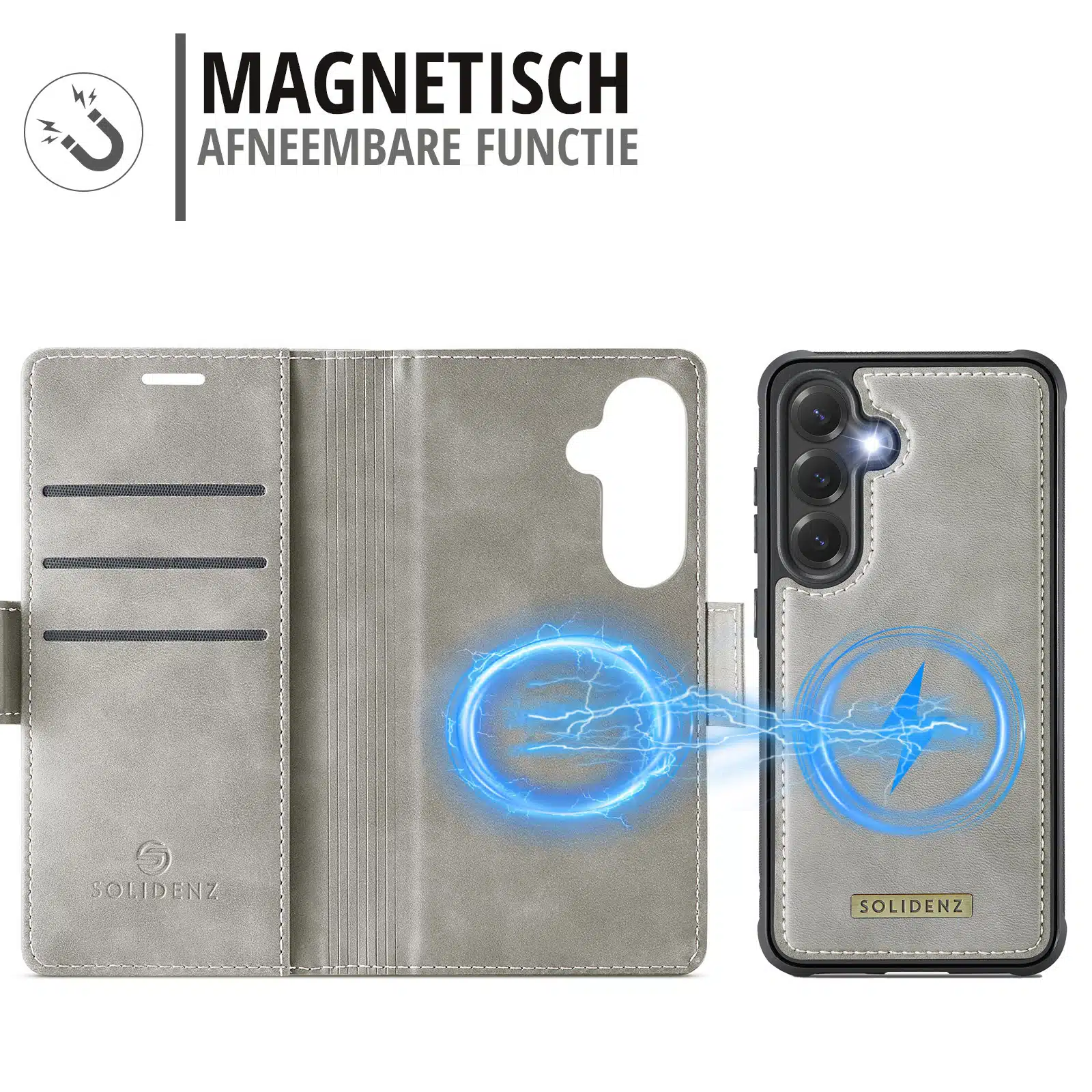 Deze luxe 2-in-1 wallet case van Solidenz combineert elegantie met functionaliteit. Dankzij het afneembare magnetische ontwerp gebruik je jouw telefoon flexibel zoals jij dat wilt: als bookcase voor extra bescherming en pasjesruimte, of als los hoesje voor onderweg. Volledig compatibel met MagSafe opladen!