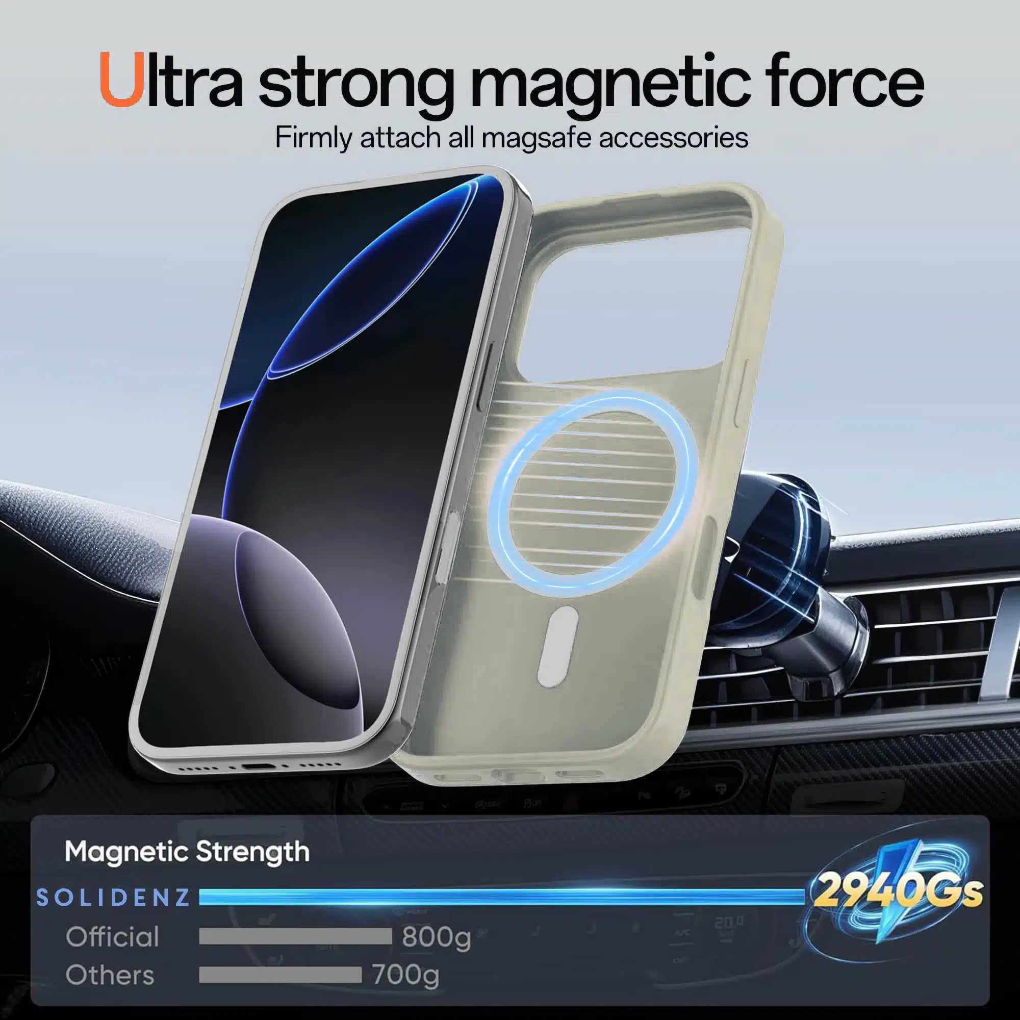 - Sterke magnetische grip voor MagSafe opladers, autohouders en wallets.