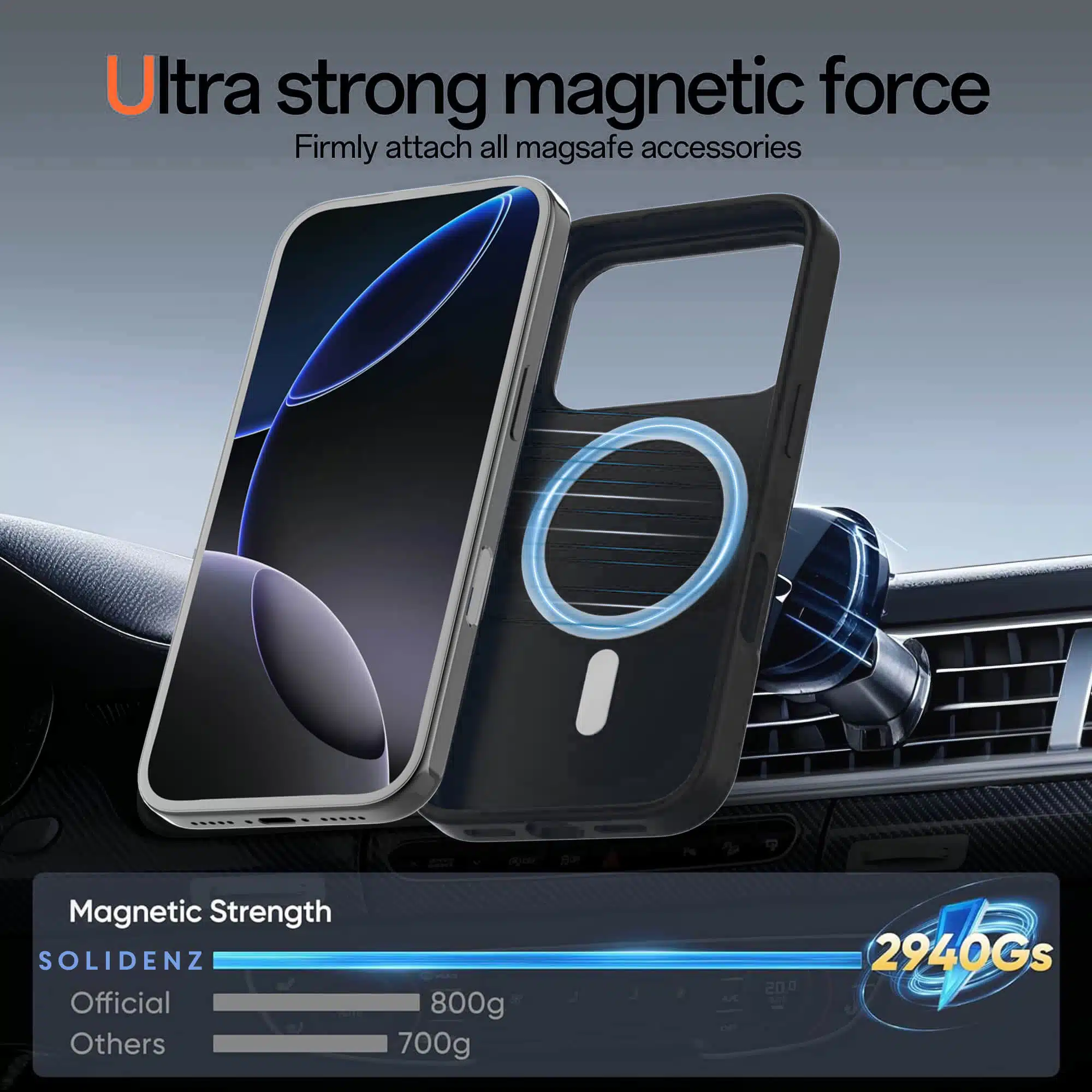- Sterke magnetische grip voor MagSafe opladers, autohouders en wallets.