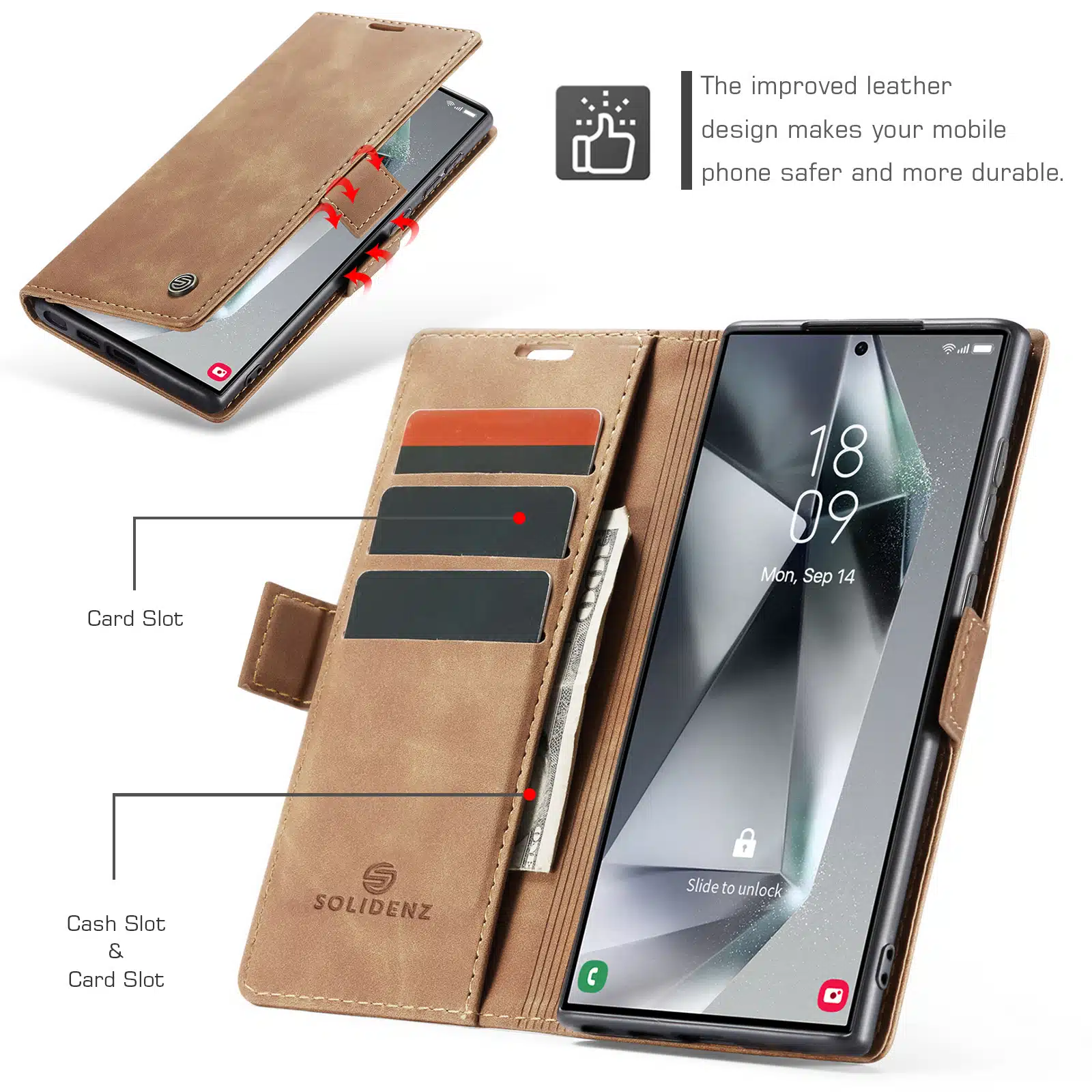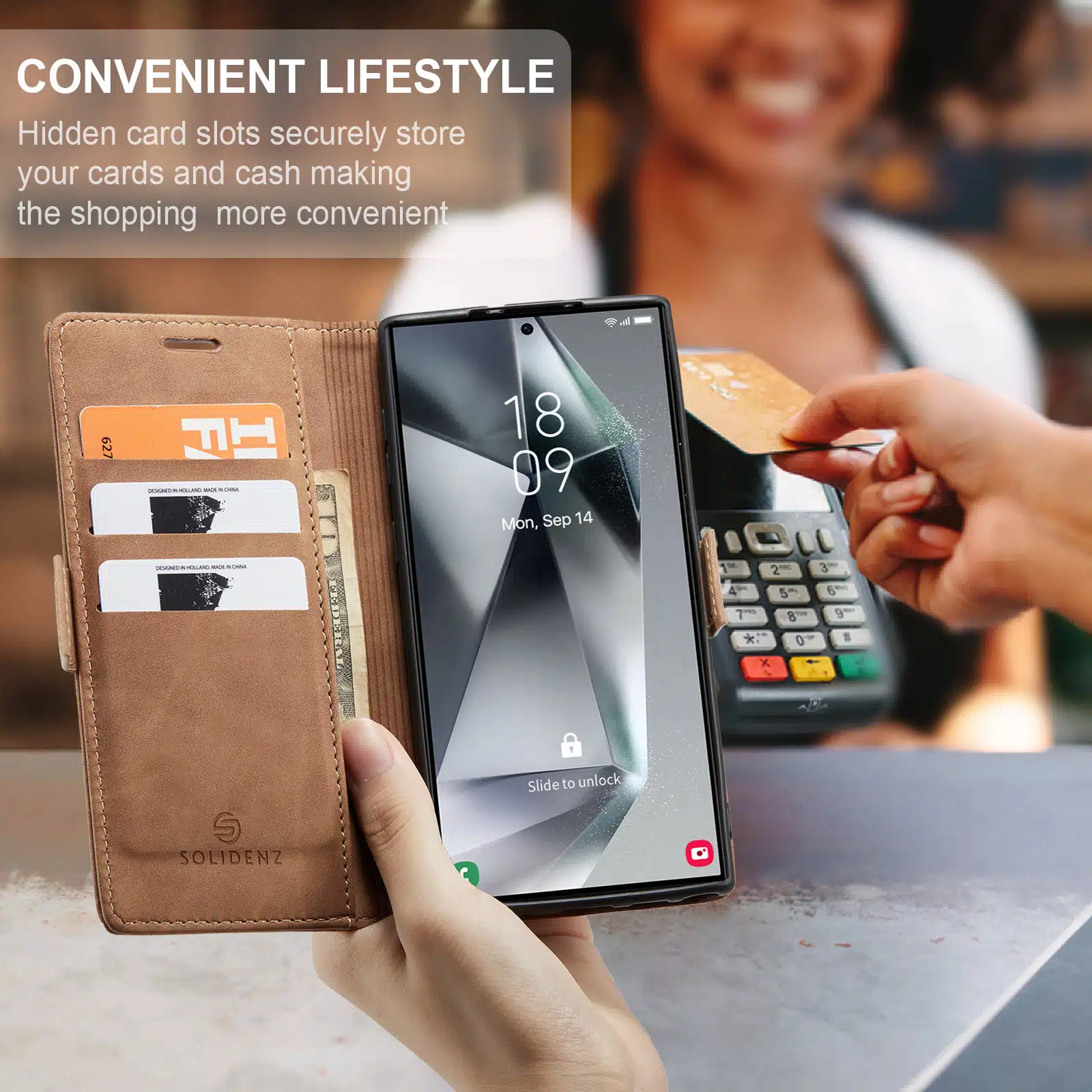 De cover waarin de smartphone in geplaatst wordt is gemaakt van schokbestendige siliconen wat ideaal is voor het verlenen van het best mogelijke protectie van de telefoon. De Solidenz telefoonhoes beschikt over 3 pasgleuven voor het veilig opbergen van de kaarten. Daarnaast kan achter de kaarten nog briefgeld gestopt worden in een aparte ruimte. De case sluit zich door middel van een magnetisch klepje waarmee de cover volledig wordt afgesloten. Let wel, bij het stoppen van teveel pasjes in de hoes werkt de magnetische sluiting minder goed.
