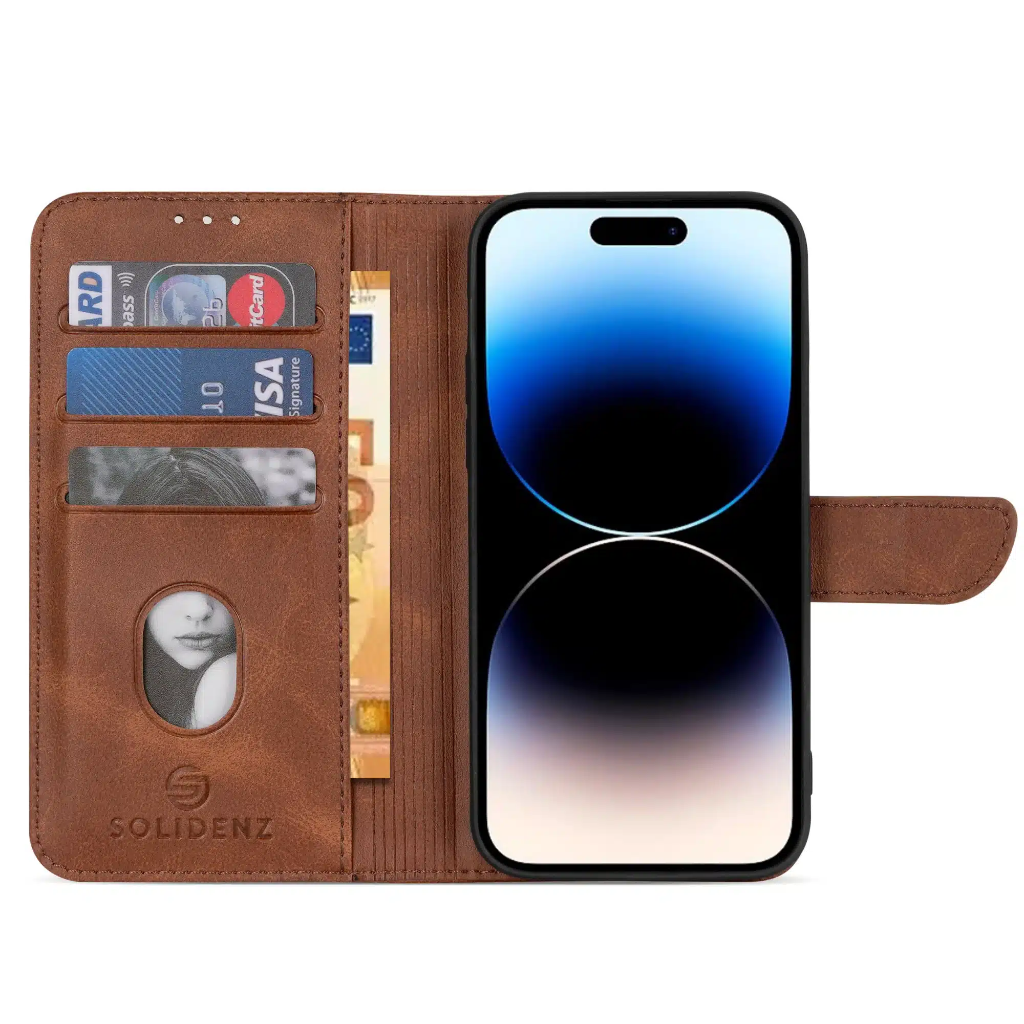 De cover waarin de smartphone in geplaatst wordt is gemaakt van schokbestendige siliconen wat ideaal is voor het verlenen van het best mogelijke protectie van de telefoon. De Solidenz telefoonhoes beschikt over 3 pasgleuven voor het veilig opbergen van de kaarten. Daarnaast kan achter de kaarten nog briefgeld gestopt worden in een aparte ruimte. De case sluit zich door middel van een magnetisch klepje waarmee de cover volledig wordt afgesloten. Let wel, bij het stoppen van teveel pasjes in de hoes werkt de magnetische sluiting minder goed. De telefoonhoes is verder eenvoudig op te vouwen tot een standaard voor het makkelijk neerzetten van de telefoon op een tafel. Bovendien zijn de uitsparingen handig ontworpen zodat na het opnemen van een telefoonoproep het mogelijk is om met een gesloten cover verder te bellen.