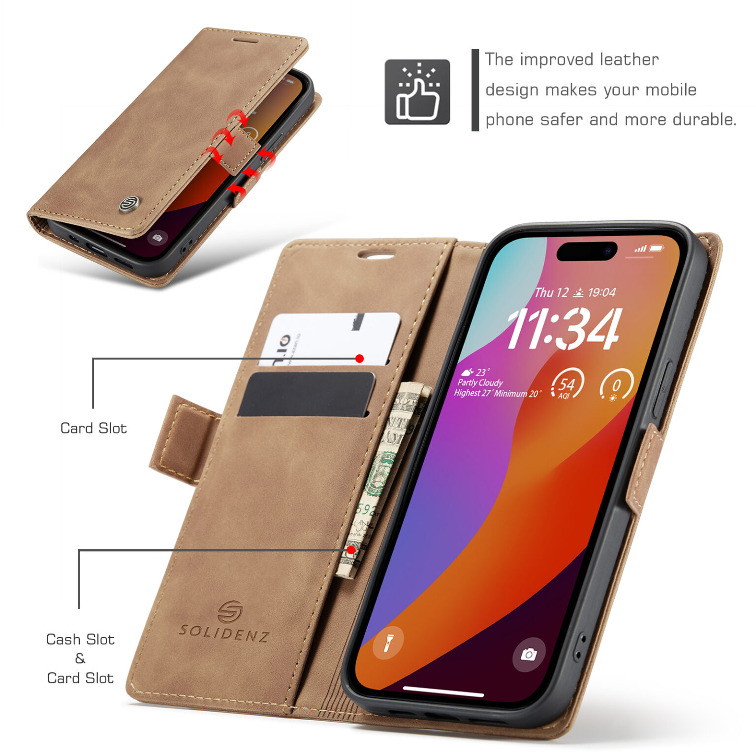 De Solidenz hoes is gemaakt van PU-leer wat alleen maar mooier wordt naarmate het wordt gebruikt. Dit effect karakteriseert de kwaliteit van de premium materialen die gebruikt zijn ter vervaardiging van de smartphone cover. Het design van de case is zo compact mogelijk ontworpen waardoor het ideaal is voor dagelijks gebruik. De telefoon met de hoes eromheen is zeer eenvoudig in en uit de broekzak te halen. De cover waarin de smartphone in geplaatst wordt is gemaakt van schokbestendige siliconen wat ideaal is voor het verlenen van het best mogelijke protectie van de telefoon. De camera opening aan de achterkant van de hoes is diep ontworpen zodat de randen om de camera heen ver over de camera heen vallen. Zo voorkom je een directe klap van de camera op de grond. De Solidenz Urban Book beschikt over 2 pasgleuven voor het veilig opbergen van de kaarten. De case heeft een klein magnetisch klepje waarmee de cover volledig wordt afgesloten. De telefoonhoes is verder eenvoudig op te vouwen tot een standaard voor het makkelijk neerzetten van de telefoon op een tafel. Bovendien zijn de uitsparingen handig ontworpen zodat na het opnemen van een telefoonoproep het mogelijk is om met een gesloten cover verder te bellen.