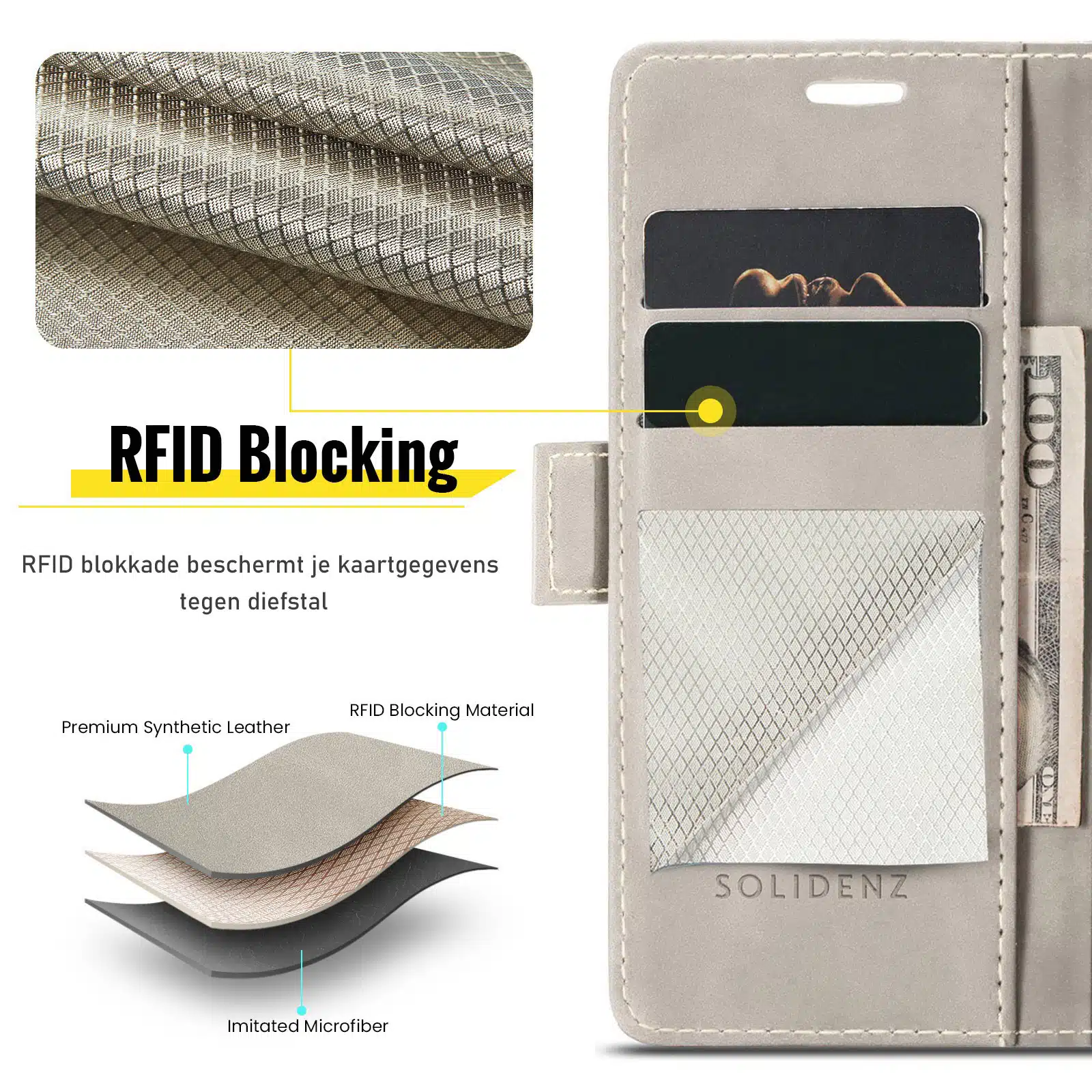 De cover waarin de smartphone in geplaatst wordt is gemaakt van schokbestendige siliconen wat ideaal is voor het verlenen van het best mogelijke protectie van de telefoon. De Solidenz telefoonhoes beschikt over 3 pasgleuven voor het veilig opbergen van de kaarten. Daarnaast kan achter de kaarten nog briefgeld gestopt worden in een aparte ruimte. De case sluit zich door middel van een magnetisch klepje waarmee de cover volledig wordt afgesloten. Let wel, bij het stoppen van teveel pasjes in de hoes werkt de magnetische sluiting minder goed.