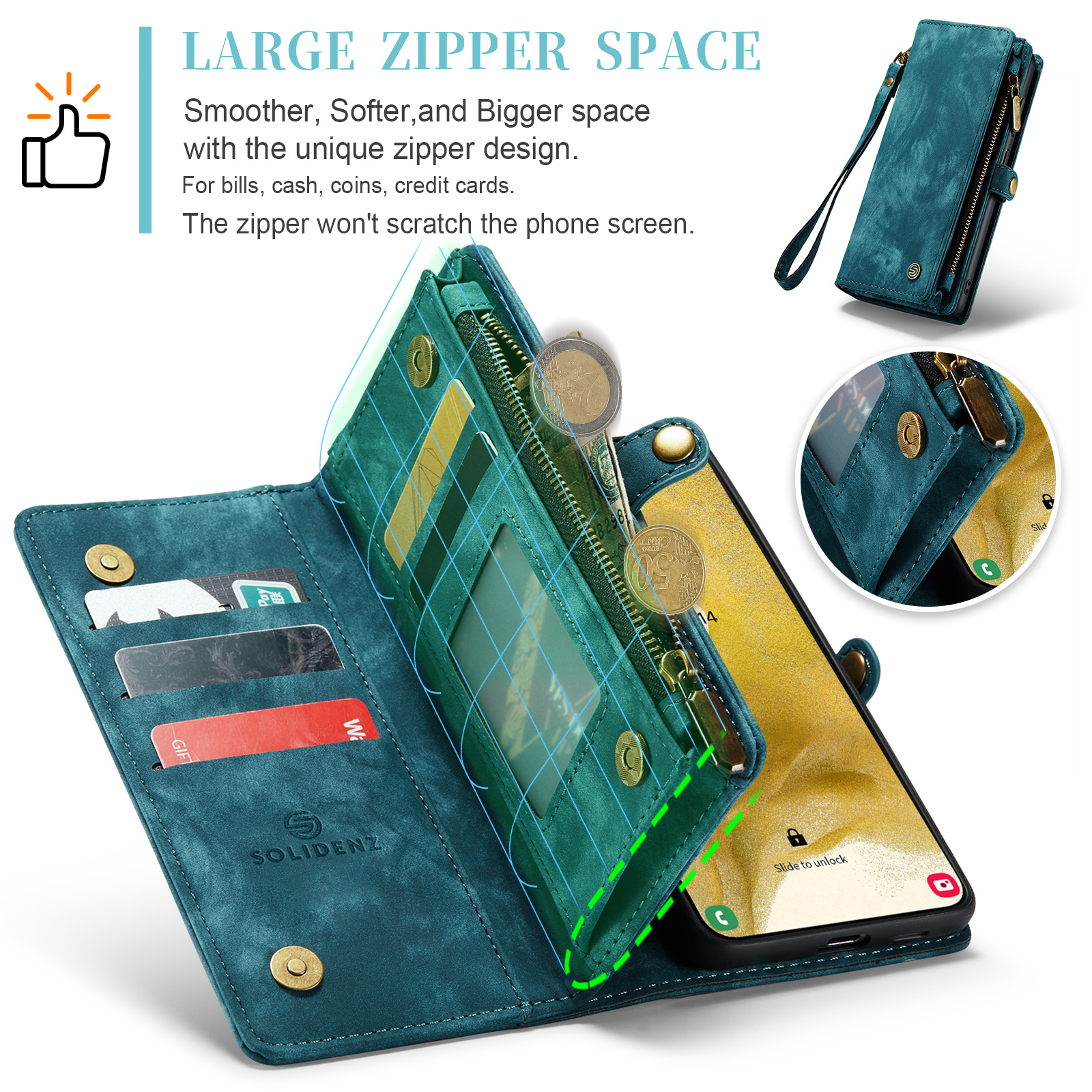 Dankzij de vele functionaliteiten van dit Solidenz hoesje kan je jouw portemonnee voortaan thuislaten! Het hoesje heeft verschillende opbergvakken en kaartsleuven, waardoor je 5 pasjes, munt- en briefgeld kunt opbergen. Ook belangrijk, het hoesje is voorzien van een stevige sluiting, zodat je kostbare spullen veilig blijven.