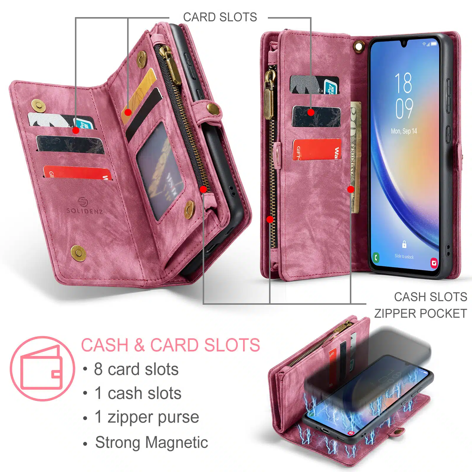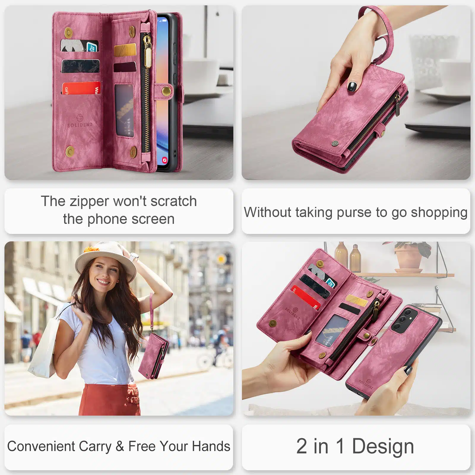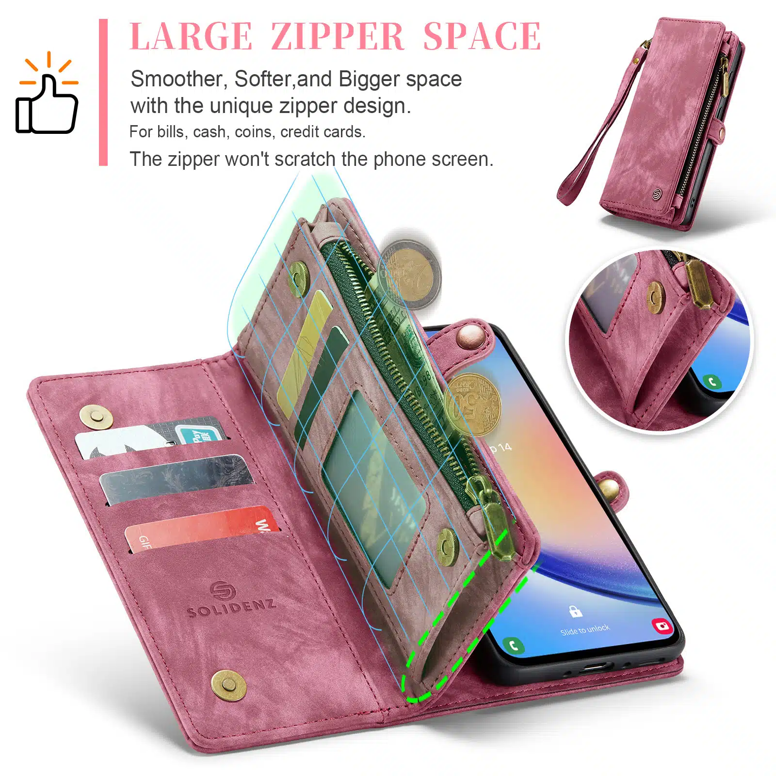 De Solidenz Urban Wallet beschikt over 8 pasgleuven voor het veilig opbergen van de kaarten. Bovendien beschik je over een aparte met rits afsluitbare ruimte voor brief- en muntgeld. De case heeft een kleine drukknop wat magnetisch is voor het volledig afsluiten van de telefooncover. De telefoonhoes is verder eenvoudig op te vouwen tot een standaard voor het makkelijk neerzetten van de telefoon op een tafel. Het hoesje is een 2in1 hoes, wat betekent dat de binnenkant magnetisch uit de hoes in en uithaalbaar is. Zo kun je de binnenste siliconen hoes uit de portemonnee halen voor bijvoorbeeld een autohouder of wanneer je een compactere hoes nodig hebt.