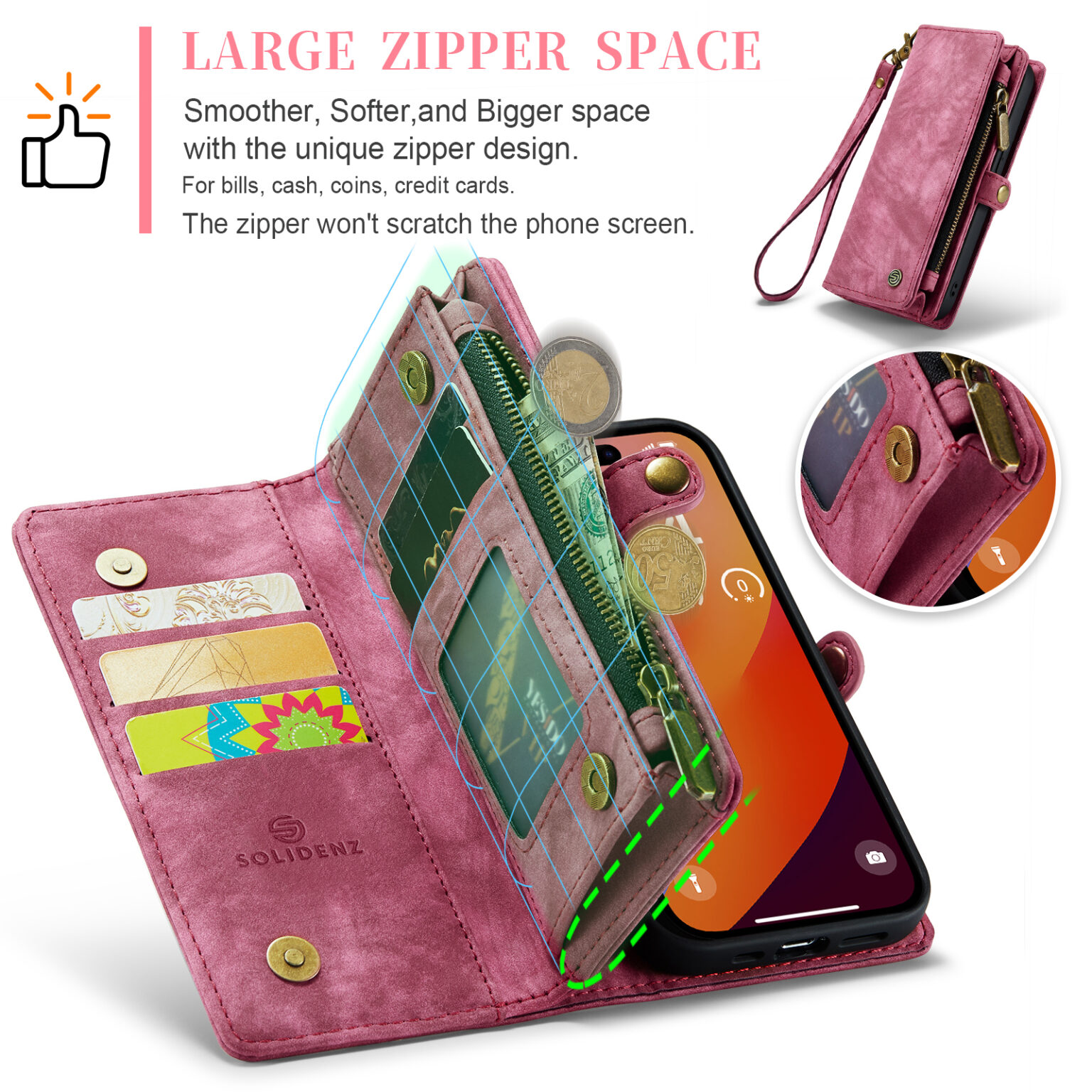 De Solidenz Urban Wallet beschikt over 8 pasgleuven voor het veilig opbergen van de kaarten. Bovendien beschik je over een aparte met rits afsluitbare ruimte voor brief- en muntgeld. De case heeft een kleine drukknop wat magnetisch is voor het volledig afsluiten van de telefooncover. De telefoonhoes is verder eenvoudig op te vouwen tot een standaard voor het makkelijk neerzetten van de telefoon op een tafel. Het hoesje is een 2in1 hoes, wat betekent dat de binnenkant magnetisch uit de hoes in en uithaalbaar is. Zo kun je de binnenste siliconen hoes uit de portemonnee halen voor bijvoorbeeld een autohouder of wanneer je een compactere hoes nodig hebt.