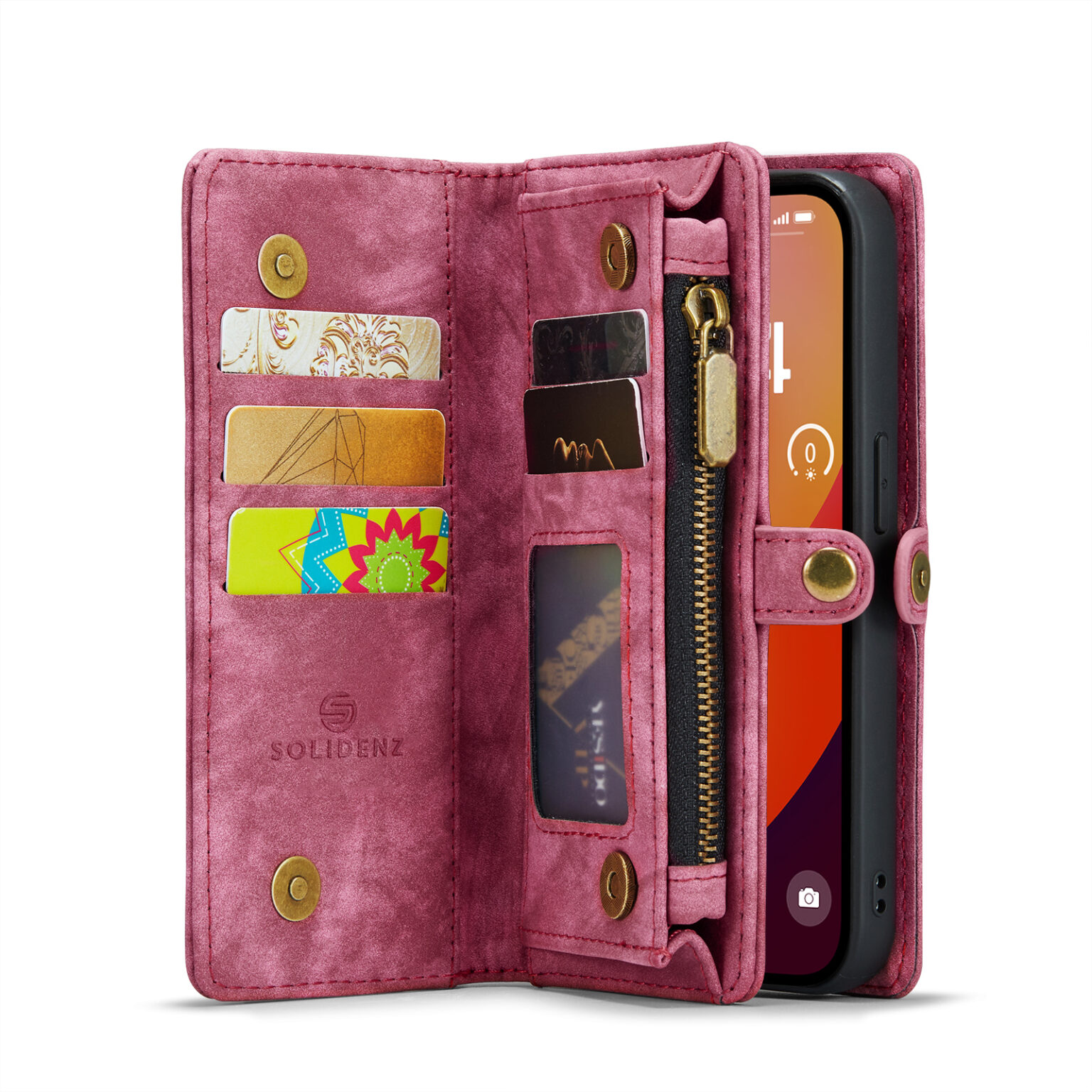 De Solidenz Urban Wallet beschikt over 8 pasgleuven voor het veilig opbergen van de kaarten. Bovendien beschik je over een aparte met rits afsluitbare ruimte voor brief- en muntgeld. De case heeft een kleine drukknop wat magnetisch is voor het volledig afsluiten van de telefooncover. De telefoonhoes is verder eenvoudig op te vouwen tot een standaard voor het makkelijk neerzetten van de telefoon op een tafel. Het hoesje is een 2in1 hoes, wat betekent dat de binnenkant magnetisch uit de hoes in en uithaalbaar is. Zo kun je de binnenste siliconen hoes uit de portemonnee halen voor bijvoorbeeld een autohouder of wanneer je een compactere hoes nodig hebt.