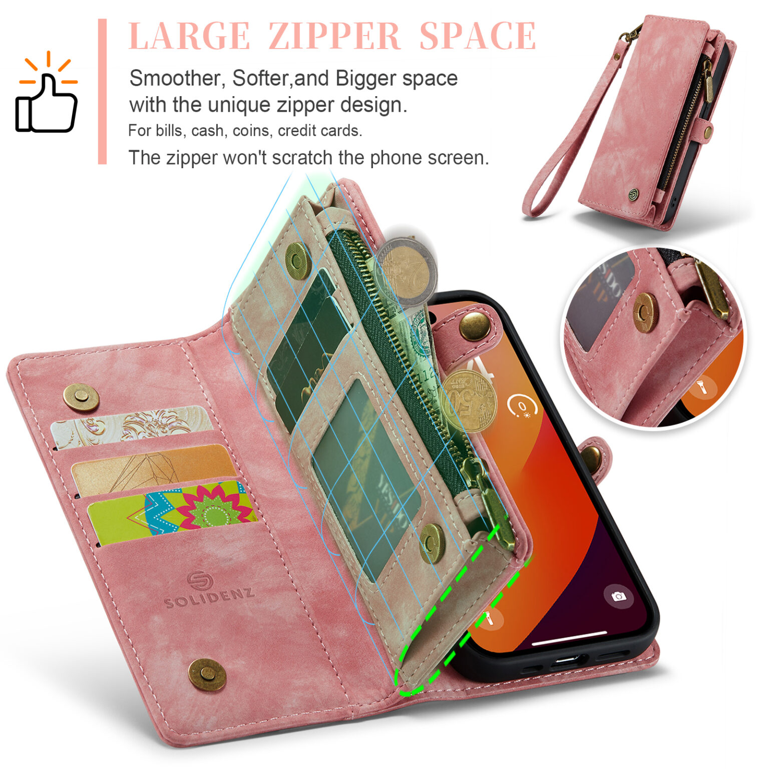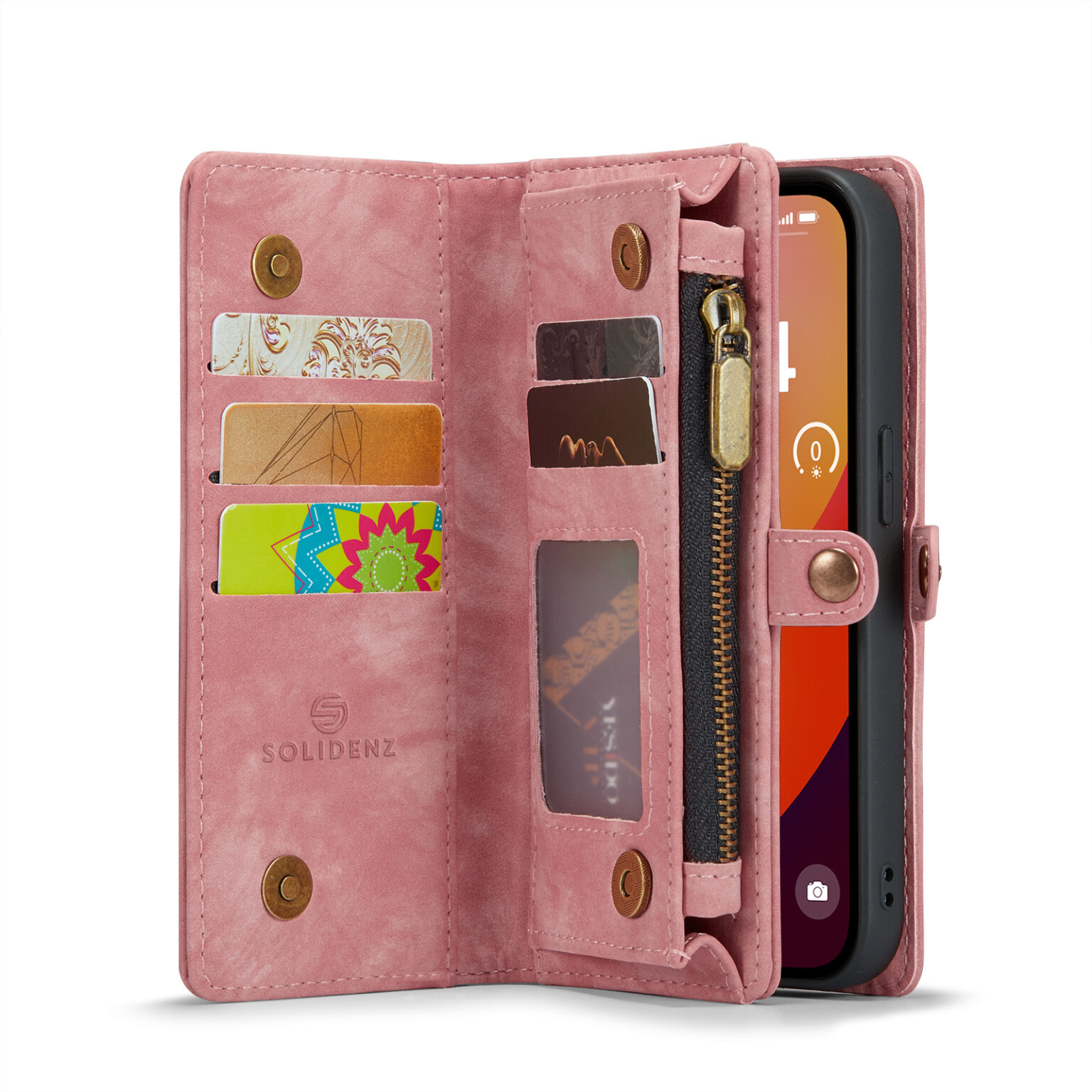 De Solidenz Urban Wallet beschikt over 8 pasgleuven voor het veilig opbergen van de kaarten. Bovendien beschik je over een aparte met rits afsluitbare ruimte voor brief- en muntgeld. De case heeft een kleine drukknop wat magnetisch is voor het volledig afsluiten van de telefooncover. De telefoonhoes is verder eenvoudig op te vouwen tot een standaard voor het makkelijk neerzetten van de telefoon op een tafel. Het hoesje is een 2in1 hoes, wat betekent dat de binnenkant magnetisch uit de hoes in en uithaalbaar is. Zo kun je de binnenste siliconen hoes uit de portemonnee halen voor bijvoorbeeld een autohouder of wanneer je een compactere hoes nodig hebt.