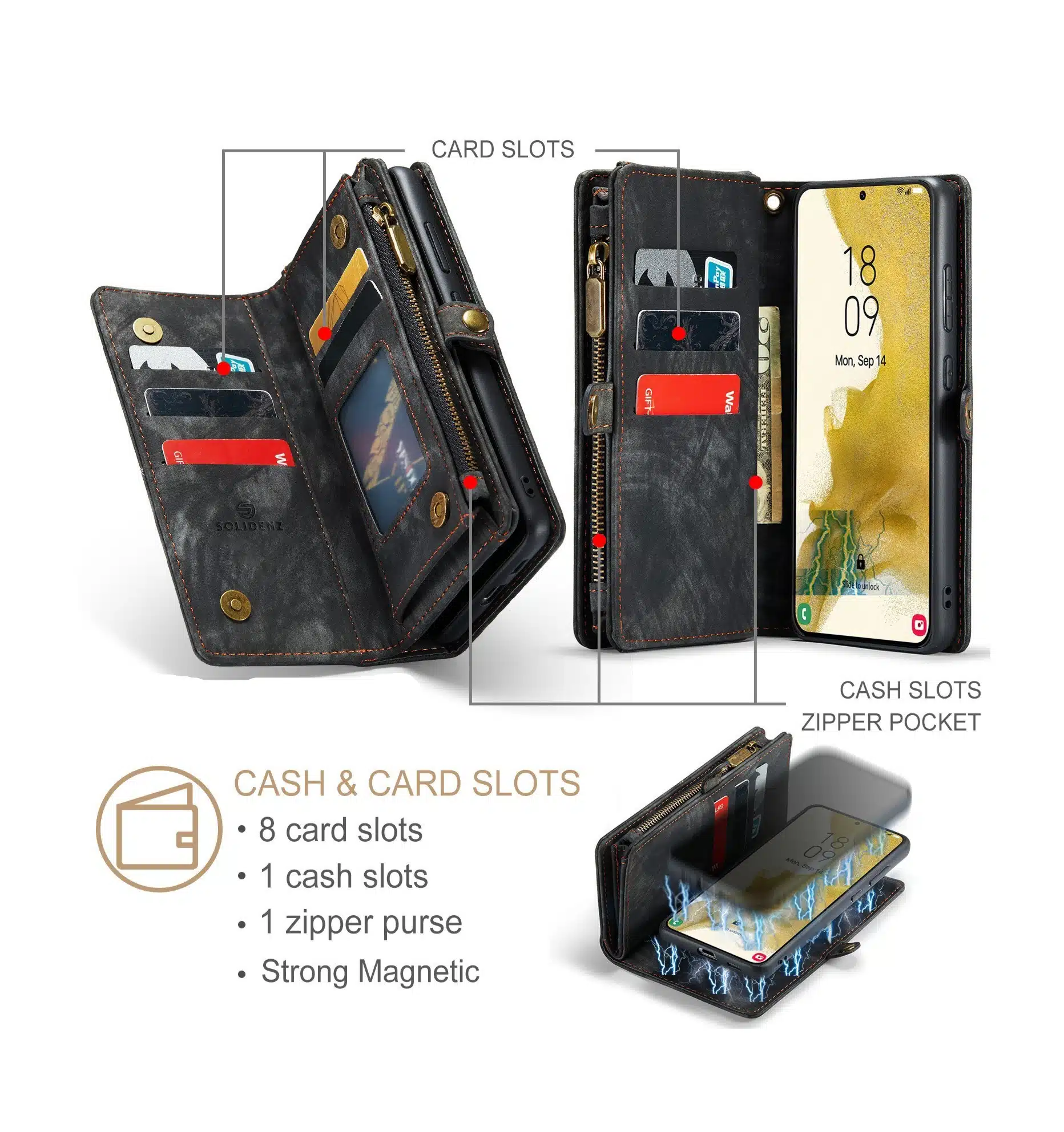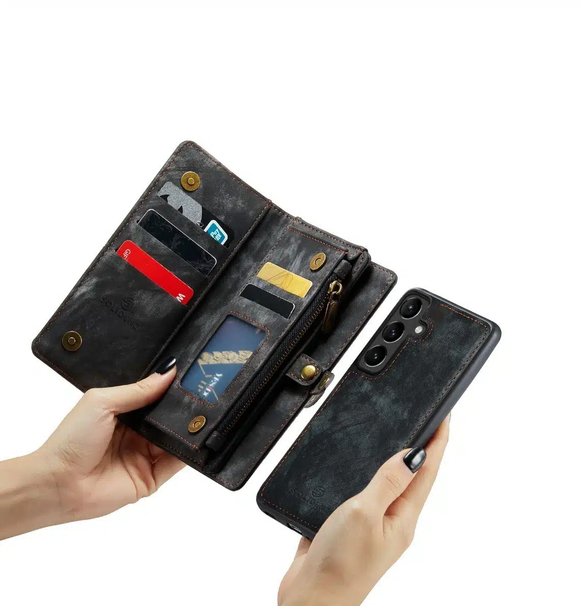 De Solidenz Urban Wallet beschikt over 8 pasgleuven voor het veilig opbergen van de kaarten. Bovendien beschik je over een aparte met rits afsluitbare ruimte voor brief- en muntgeld. De case heeft een kleine drukknop wat magnetisch is voor het volledig afsluiten van de telefooncover. De telefoonhoes is verder eenvoudig op te vouwen tot een standaard voor het makkelijk neerzetten van de telefoon op een tafel. Het hoesje is een 2in1 hoes, wat betekent dat de binnenkant magnetisch uit de hoes in en uithaalbaar is. Zo kun je de binnenste siliconen hoes uit de portemonnee halen voor bijvoorbeeld een autohouder of wanneer je een compactere hoes nodig hebt.