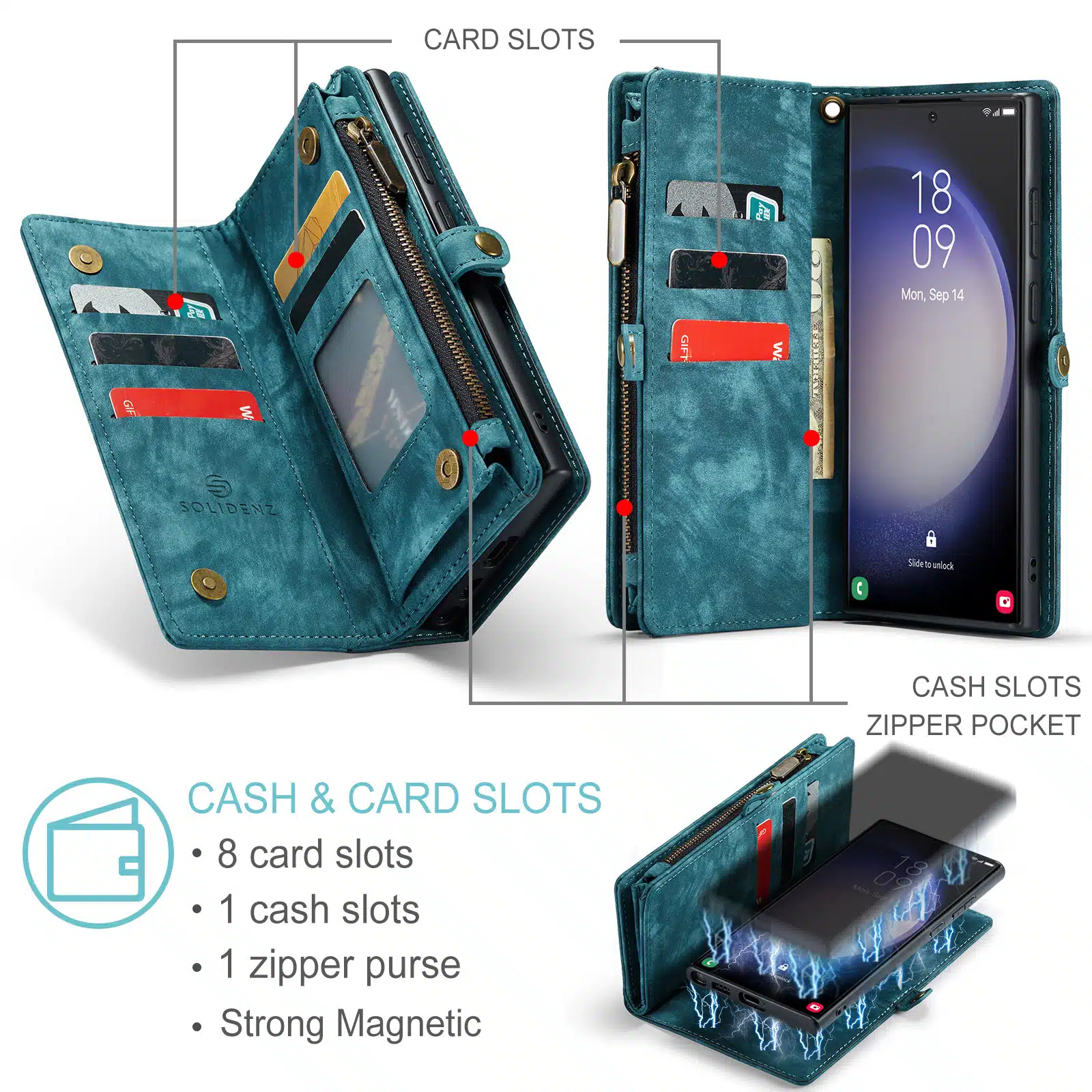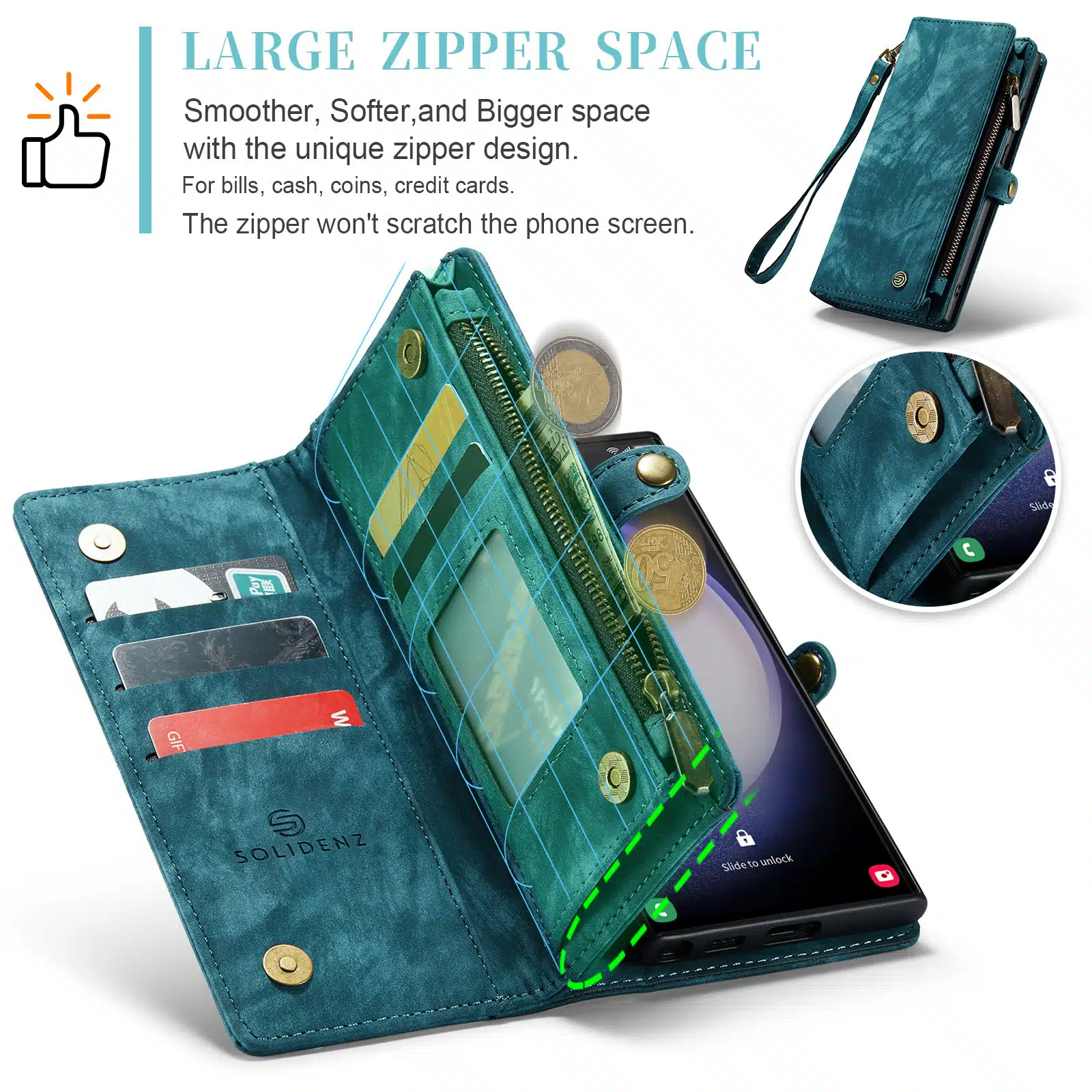 De cover waarin de smartphone in geplaatst wordt is gemaakt van schokbestendige siliconen wat ideaal is voor het verlenen van het best mogelijke protectie van de telefoon. De Solidenz telefoonhoes beschikt over 3 pasgleuven voor het veilig opbergen van de kaarten. Daarnaast kan achter de kaarten nog briefgeld gestopt worden in een aparte ruimte. De case sluit zich door middel van een magnetisch klepje waarmee de cover volledig wordt afgesloten. Let wel, bij het stoppen van teveel pasjes in de hoes werkt de magnetische sluiting minder goed.