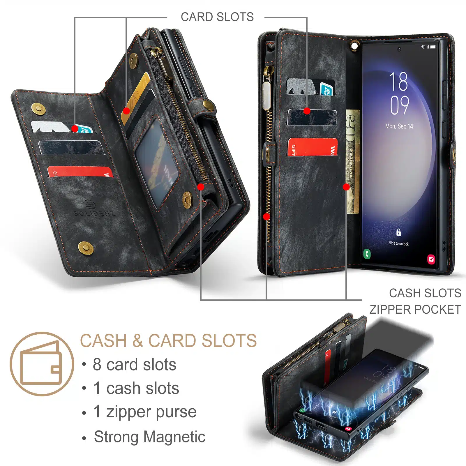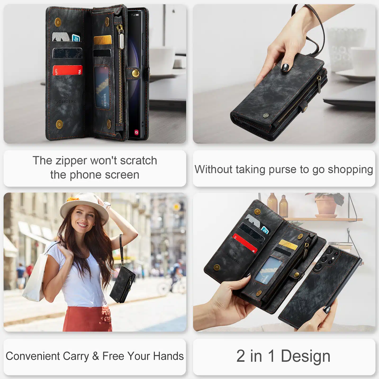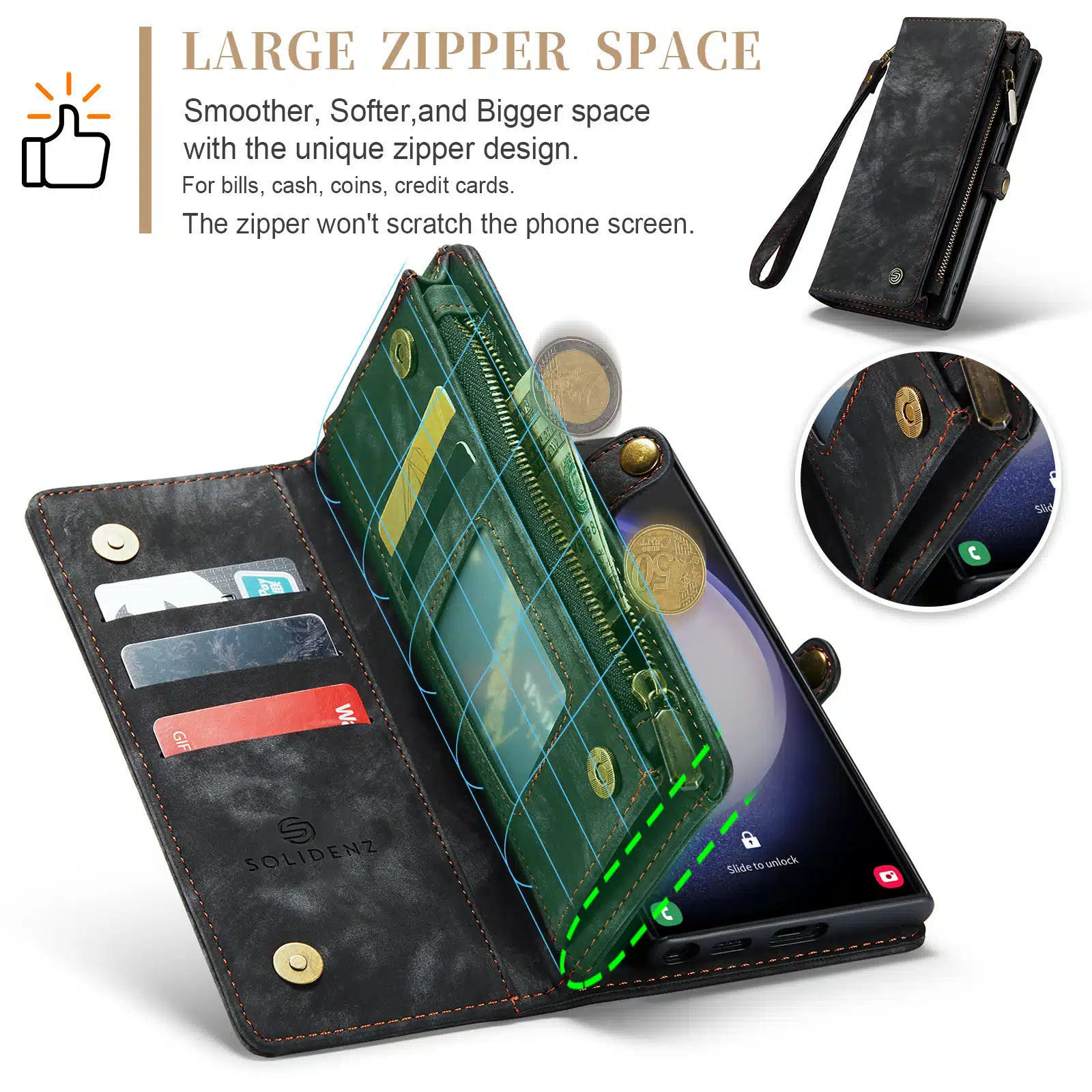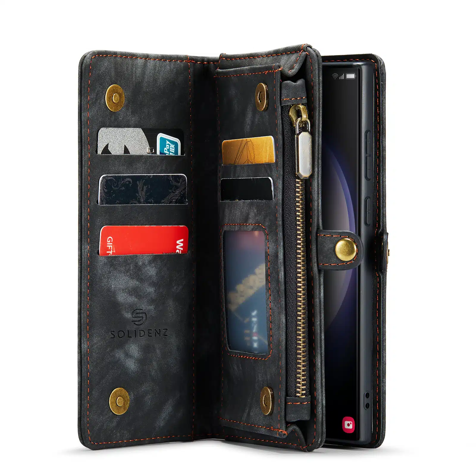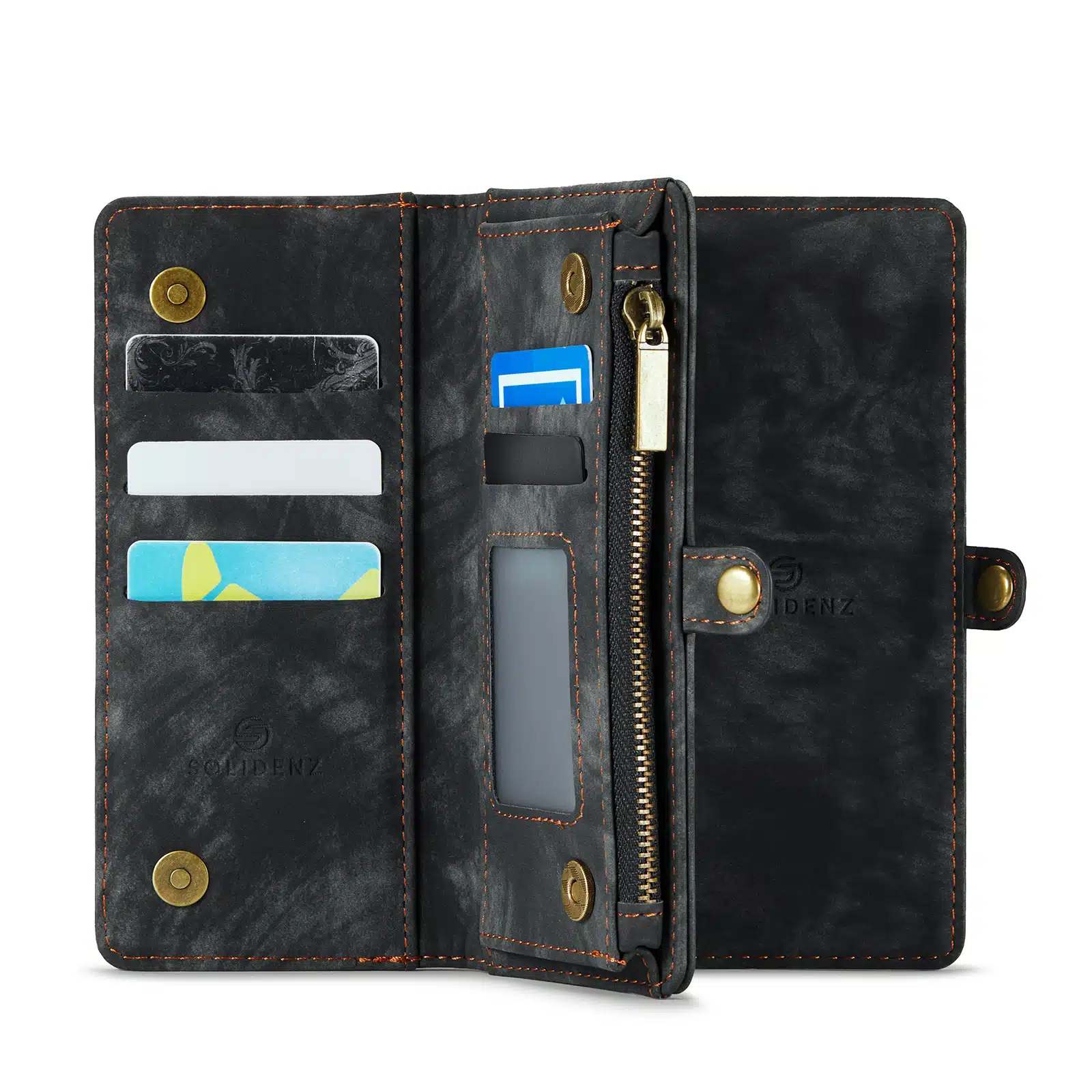 De Solidenz Urban Wallet beschikt over 8 pasgleuven voor het veilig opbergen van de kaarten. Bovendien beschik je over een aparte met rits afsluitbare ruimte voor brief- en muntgeld. De case heeft een kleine drukknop wat magnetisch is voor het volledig afsluiten van de telefooncover. De telefoonhoes is verder eenvoudig op te vouwen tot een standaard voor het makkelijk neerzetten van de telefoon op een tafel. Het hoesje is een 2in1 hoes, wat betekent dat de binnenkant magnetisch uit de hoes in en uithaalbaar is. Zo kun je de binnenste siliconen hoes uit de portemonnee halen voor bijvoorbeeld een autohouder of wanneer je een compactere hoes nodig hebt.