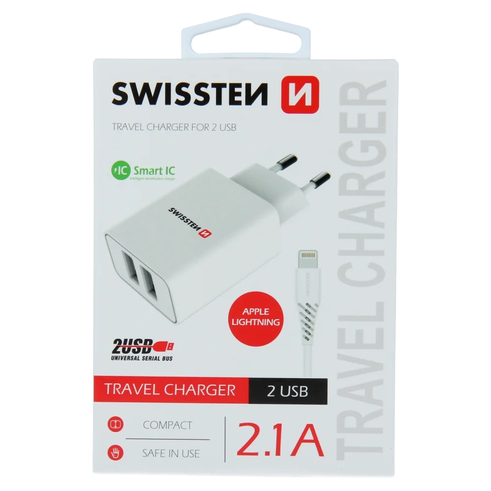 Swissten – 2.1A Dual Port Travel Charger (10.5W) Lightning – USB Cable – Wit