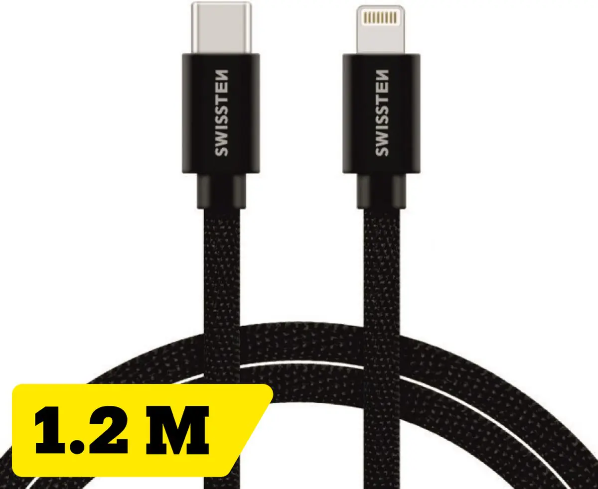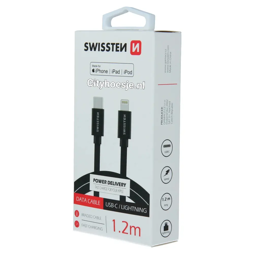 – Zwarte Swissten Lightning naar USB-C kabel van 1.2 meter.