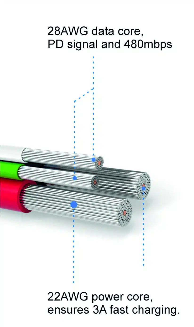 Deze Lightning naar USB-C kabel ondersteunt 3.0A snel laden dankzij de 22AWG power core. Hierdoor is het mogelijk om met de juiste adapter of powerbank je iPhone (8 t/m 14 serie) snel op te laden. Hierdoor is mogelijk om je iPhone binnen 30 minuten tot 50% op te laden. De kabel ondersteunt synchroniseren op een snelheid van 480MB per seconde dankzij de 28AWG Data Core.