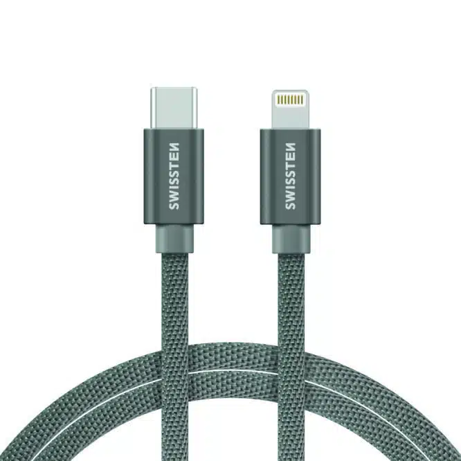 – Zwarte Swissten Lightning naar USB-C kabel van 1.2 meter.
